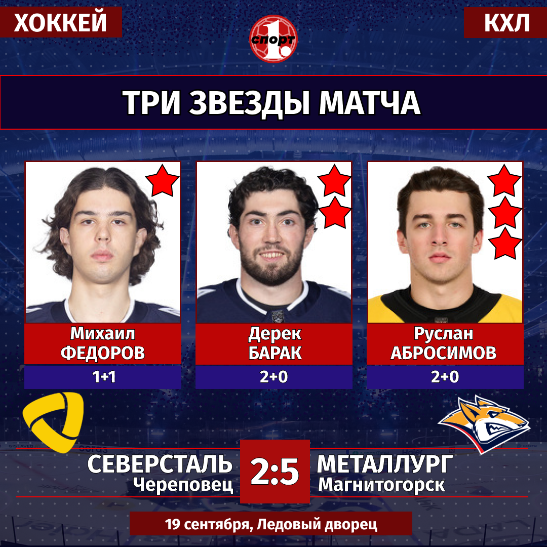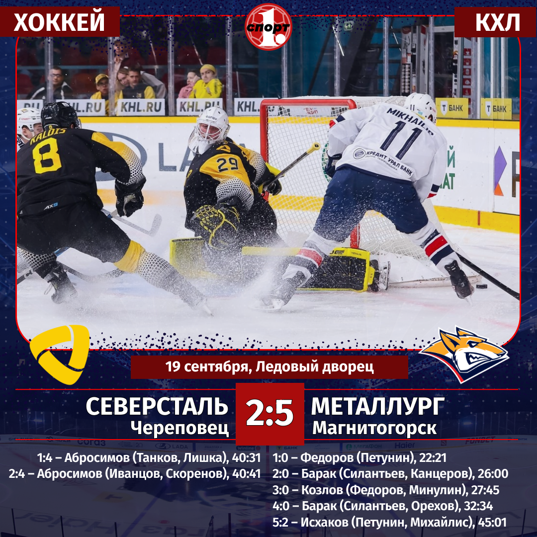 Хоккей. Чемпионат КХЛ. Сезон-2025/2026. 16 сентября. «Северсталь» (Череповец) — «Металлург» (Магнитогорск) — 2:5 (0:0, 0:4, 2:1).