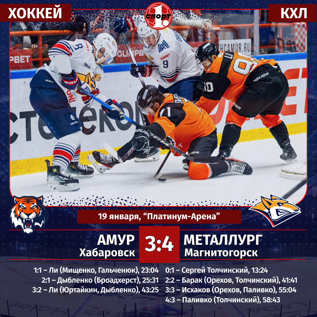 Хоккей. Сезон-2025/2026. Чемпионат КХЛ. 19 января. «Амур» (Хабаровск) — «Металлург» (Магнитогорск) — 3:4 (0:1, 2:0, 1:3).