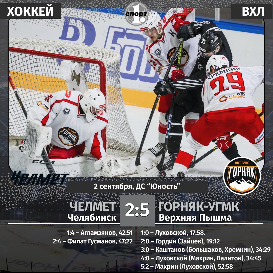 Хоккей. Чемпионат ВХЛ. 2 сентября. «Челмет» (Челябинск) — «Горняк-УГМК» (Верхняя Пышма) — 2:5 (0:2, 0:2, 2:1).