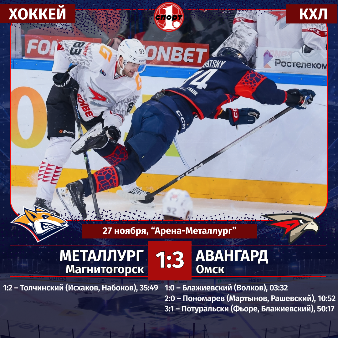 Хоккей. Сезон-2025/2026. Чемпионат КХЛ. 27 ноября. «Металлург» (Магнитогорск) — «Авангард» (Омск) — 1:3 (0:2, 1:0, 0:1).