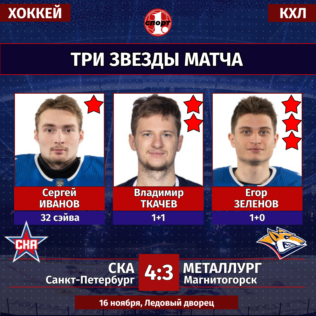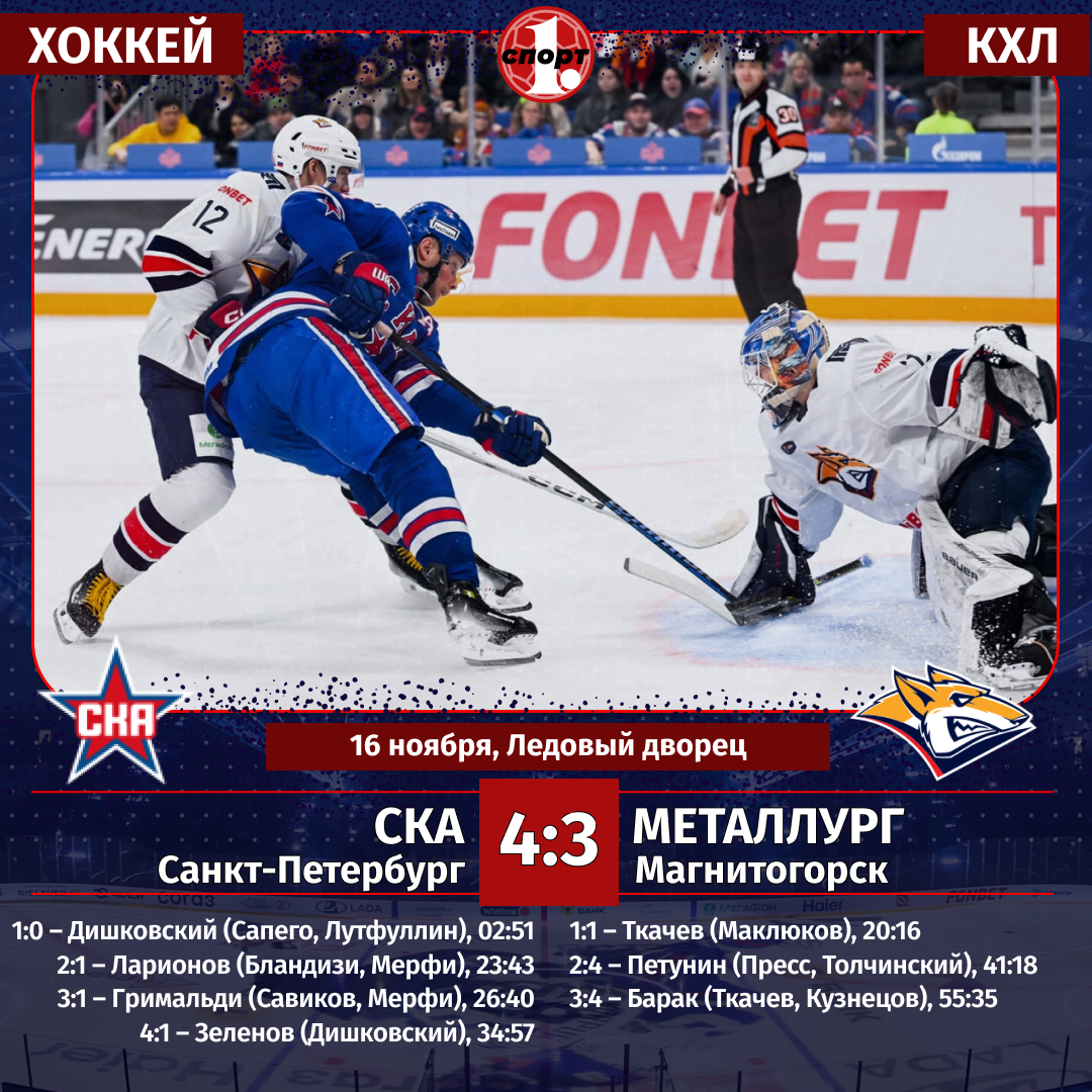 Хоккей. Сезон-2025/2026. КХЛ. 16 ноября. СКА (Санкт-Петербург) — «Металлург» (Магнитогорск) — 4:3 (1:0, 3:1, 0:2)