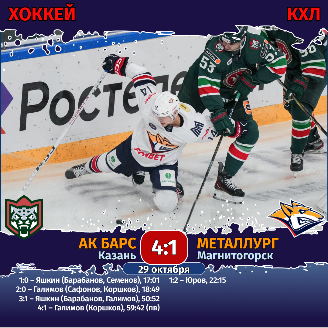 Хоккей. Чемпионат КХЛ. 29 октября. «Ак Барс» (Казань) — «Металлург» (Магнитогорск) — 4:1 (2:0, 0:1, 2:0).