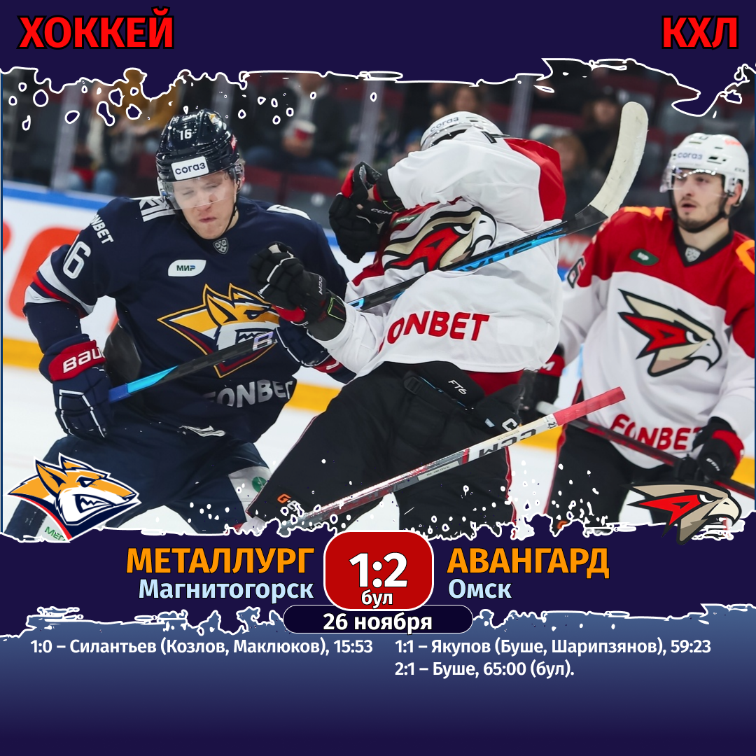 Хоккей. Чемпионат КХЛ. 26 ноября. «Металлург» (Магнитогорск) — «Авангард» (Омск) — 1:2 бул (1:0, 0:0, 0:1, 0:0, 1:0)