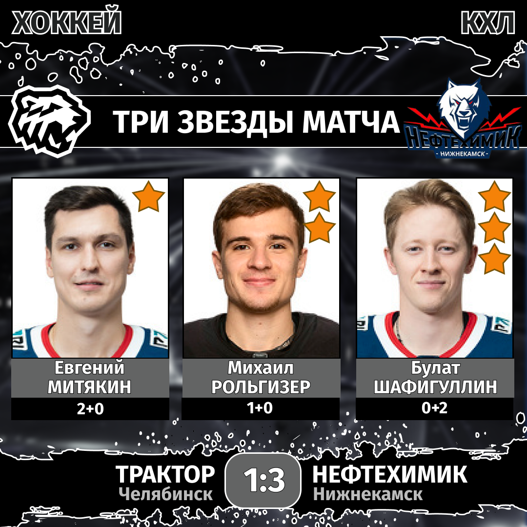В дебюте второго периода «Трактор» обрушил шквал атак на ворота соперника. И наверняка быть бы голу, если бы не досадное удаление за нарушение численного состава. «Нефтехимик» перевел дух, а затем организовал классную атаку. Причем в ней вновь ассистентом выступил Булат Шафигуллин, а автором заброшенной шайбы — Евгений Митякин.