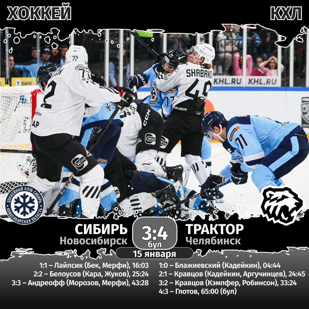 Хоккей. Чемпионат КХЛ. 15 января. «Сибирь» (Новосибирск) — «Трактор» (Челябинск) — 3:4 бул (1:1, 1:2, 1:0, 0:0, 0:1).