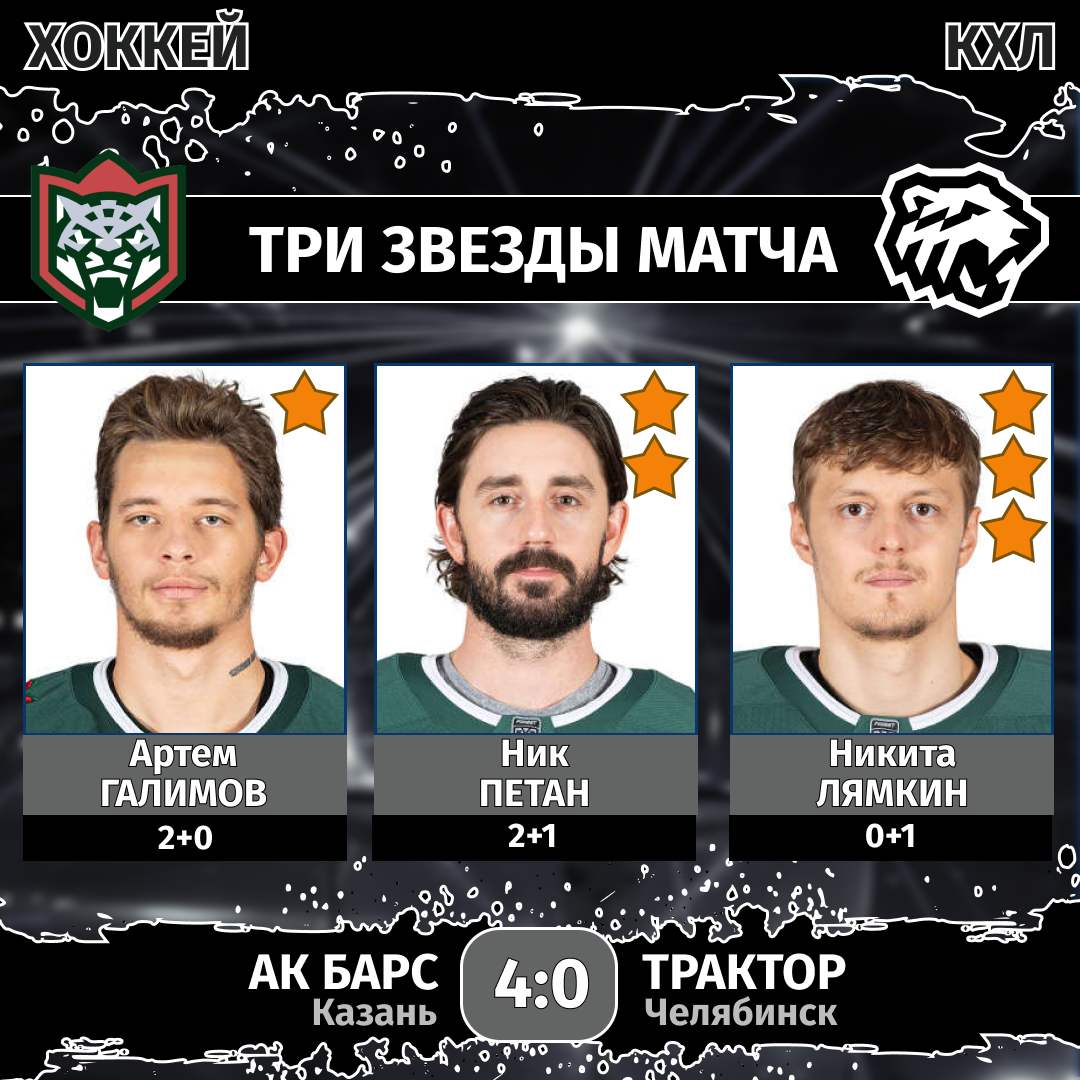 Отметим, что в третьем периоде челябинцы пытались переломить ход матча, создали немало голевых моментов, но шайба упорно не желала идти в ворота. Все стало ясно, когда на 52-й минуте Дмитрий Яшкин сделал счет 3:0. А в самой концовке казанцы забросили еще шайбу в пустые ворота, когда «черно-белые» пошли ва-банк.