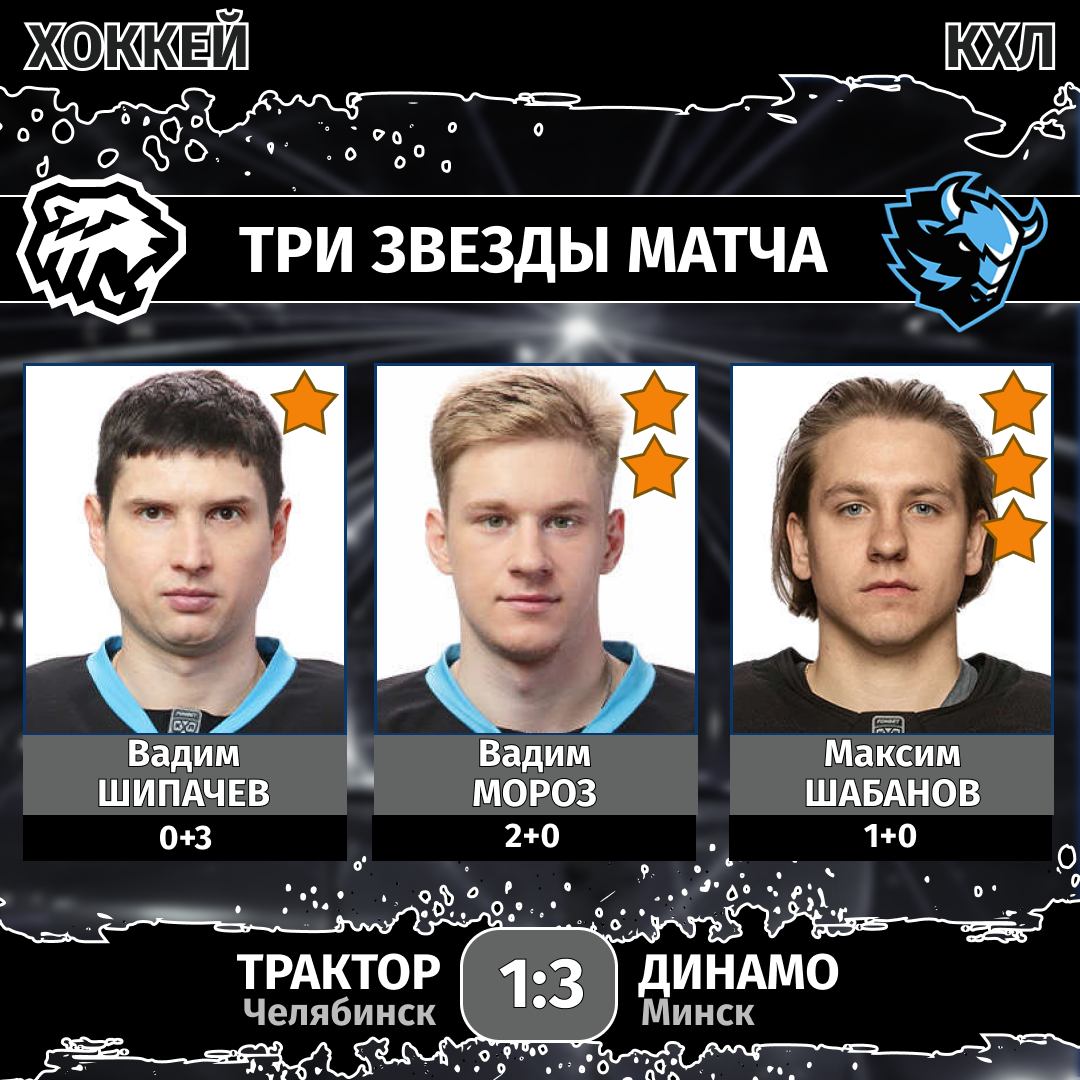 Хоккеисты челябинского «Трактора» после 10-дневной паузы сыграли не лучшим образом в чемпионате КХЛ, уступив на своем льду минскому «Динамо». Героем матча стал лучший бомбардир белорусского клуба Вадим Шипачев. Опытнейший хоккеист сделал ассистентский хет-трик и помог своей команде одержать победу со счетом 3:1. Хоккеисты «Трактора» впервые в сезоне проиграли два матча подряд соперникам в основное время матча, сообщает корреспондент ИА «Первое областное».
