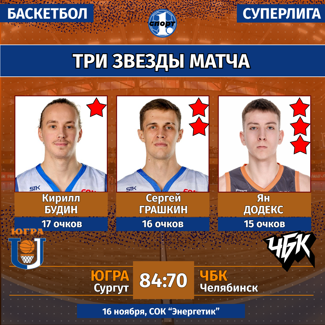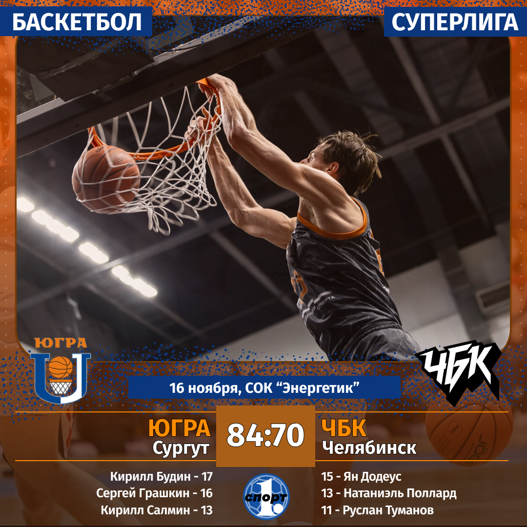 Баскетбол. Сезон-2025/2026. Суперлига. Мужчины. 16 ноября. «Югра» (Сургут) — «ЧБК» (Челябинск) — 84:70 (22:16, 27:17, 15:22, 20:15).