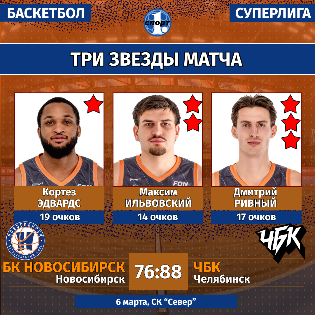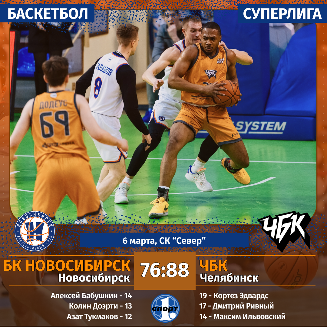 Баскетбол. Сезон-2025/2026. Суперлига. Мужчины. 6 марта. БК «Новосибирск» — «ЧБК» (Челябинск) — 76:88 (26:20, 16:20, 16:24, 18:24).