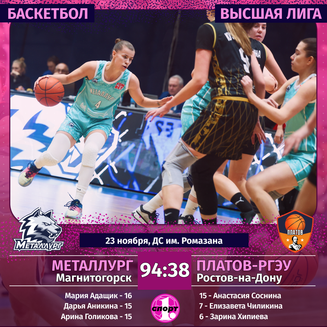 Баскетбол. Сезон-2025/2026. Высшая лига. Женщины. 23 ноября. «Металлург» (Магнитогорск) — «Платов-РГЭУ» (Ростов-на-Дону) — 94:38 (25:16, 28:4, 22:14, 19:4).