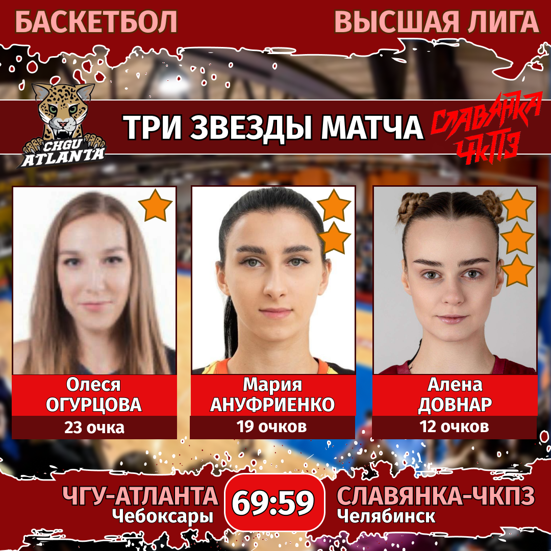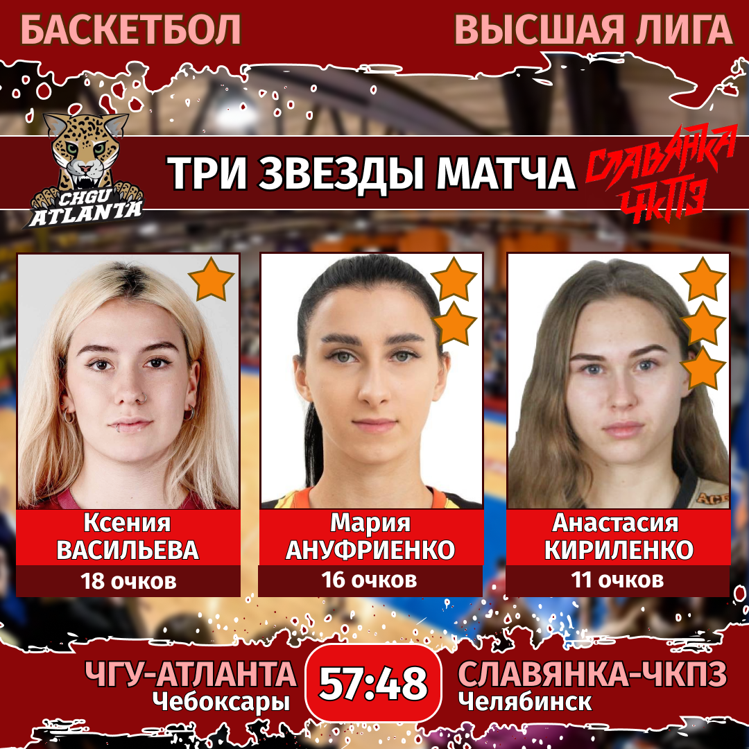 «ЧГУ-Атланта»: Ануфриенко (16), Кириленко (11), Огурцова (8), Бабкова (6), Шевченко (6), Силанова (4), Косинова (4), Галенко (2), Коробенко.