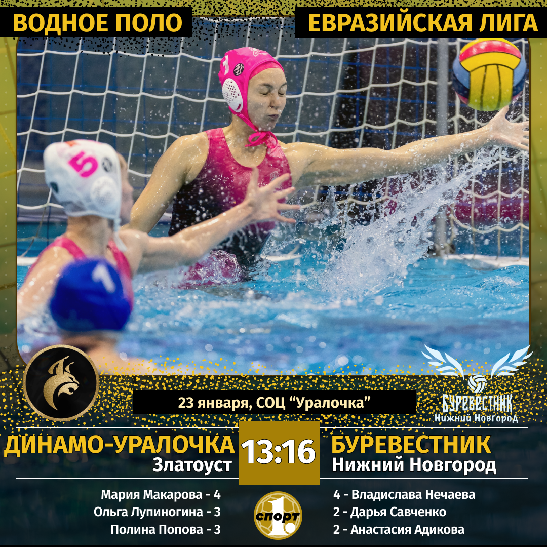 Водное поло. Сезон-2025/2026. Евразийская ватерпольная лига. Женщины. 23 января. «Динамо-Уралочка» (Златоуст) — «Буревестник» (Нижний Новгород) — 13:16 (3:5, 3:4, 4:4, 3:3).