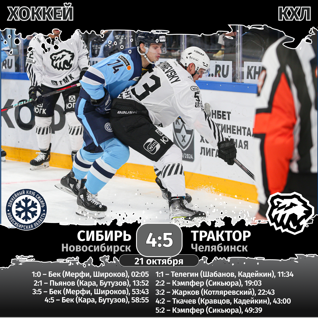 Хоккей. Чемпионат КХЛ. 21 октября. «Сибирь» (Новосибирск) — «Трактор» (Челябинск) — 4:5 (2:2, 0:1, 2:2).