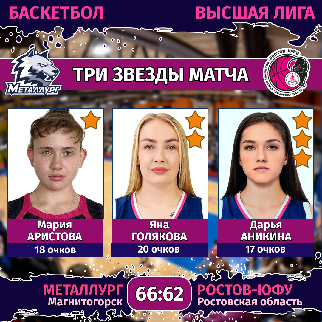 «Ростов-ЮФУ»: Кременецкая (21), Аристова (18), Чижевская (9), Дмитриенко (8), Львова (6), Бекузарова, Кривицкая, Нахимова.