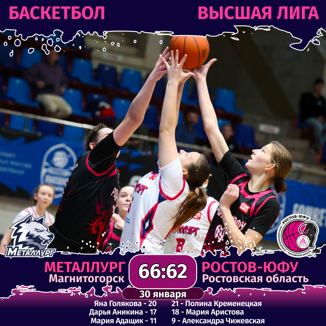 30 января. «Металлург» (Магнитогорск) — «Ростов-ЮФУ» (Ростовская область) — 66:62 (22:17, 21:9, 11:23, 12:13).