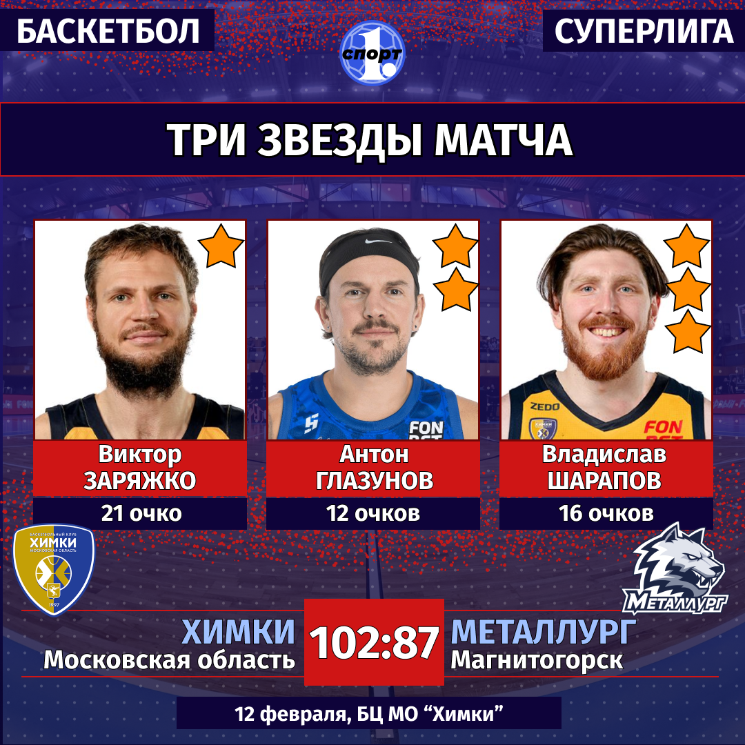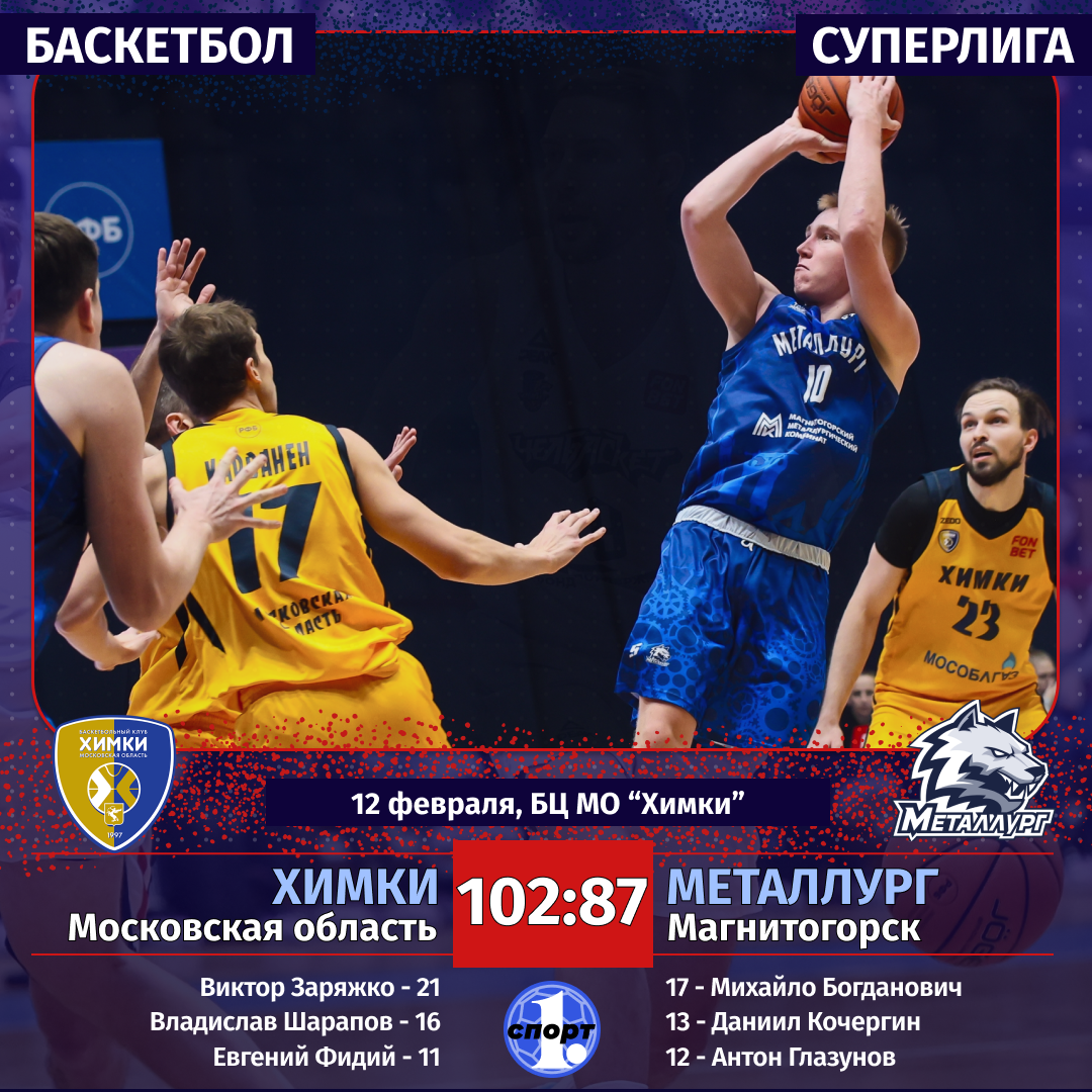 Баскетбол. Сезон-2025/2026. Суперлига. Мужчины. 12 февраля. «Химки» (Московская область) — «Металлург» (Магнитогорск) — 102:87 (35:15, 15:31, 23:24, 29:17).