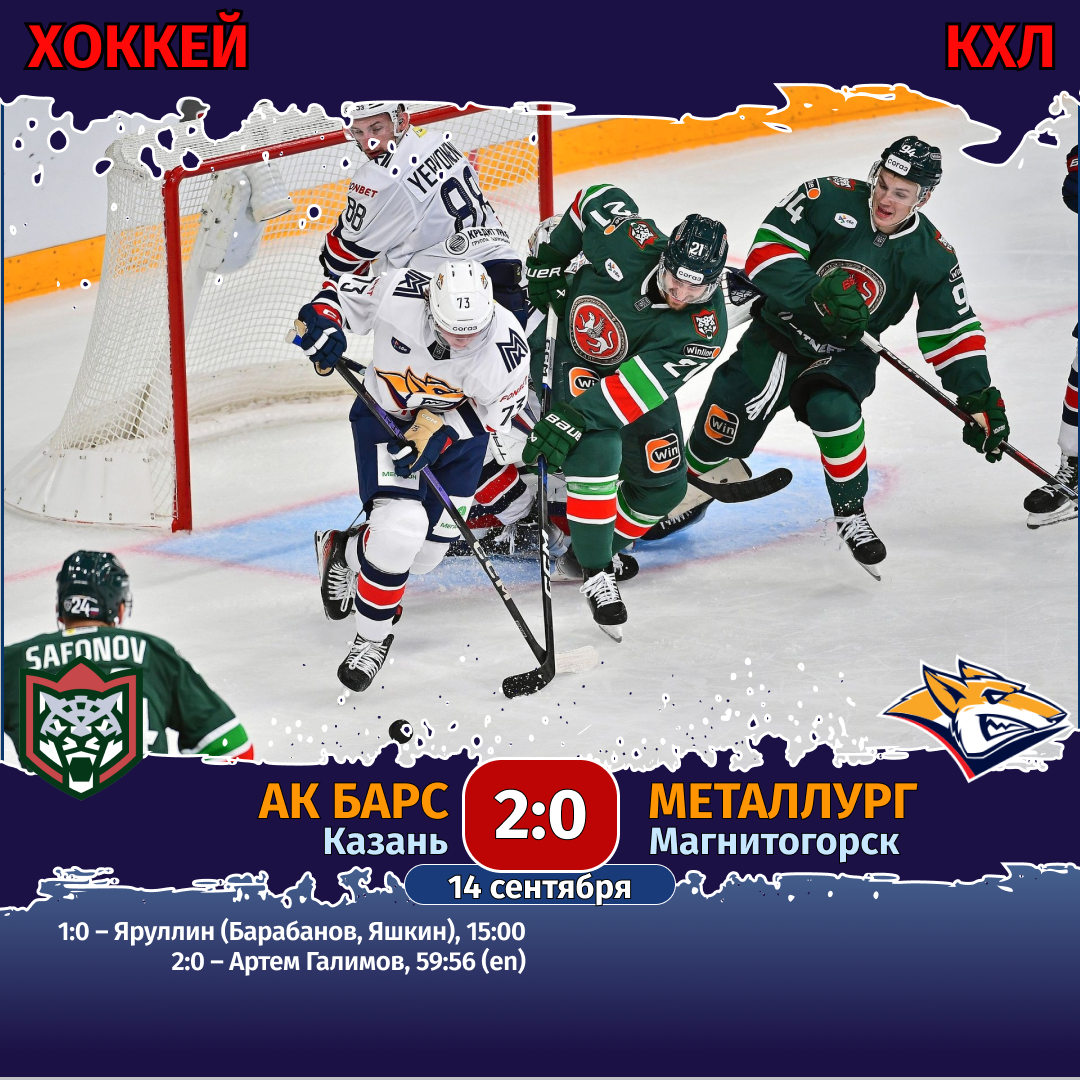 Хоккей. Чемпионат КХЛ. 14 сентября. «Ак Барс» (Казань) — «Металлург» (Магнитогорск) — 2:0 (1:0, 0:0, 1:0).