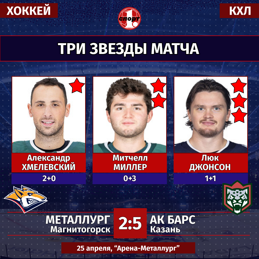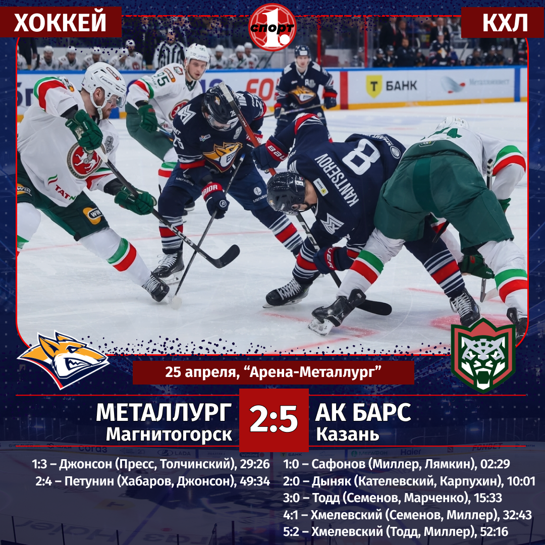 Хоккей. Сезон-2025/2026. КХЛ. Кубок Гагарина. Плей-офф. Полуфинал. Первый матч. 25 апреля. «Металлург» (Магнитогорск) — «Ак Барс» (Казань) — 2:5 (0:3, 1:1, 1:1).