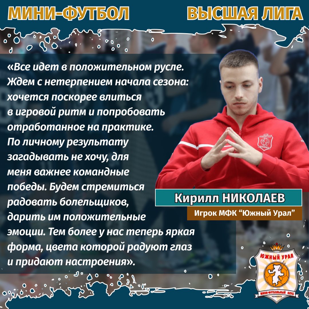 Одним из лидеров команды в предстоящем сезоне может стать Кирилл Николаев. Он уже не первый год в коллективе, является игроком-универсалом, способным сыграть на любой позиции. Его приятно удивило, как меняется отношение к МФК «Южный Урал» в Челябинске. Клуб ведет себя активно в медиапространстве, игроки стали все чаще участвовать в различных социальных акциях. Все это, по его словам, должно отразиться на популярности мини-футбола в регионе. Особенно если команда продолжит показывать хорошие результаты.