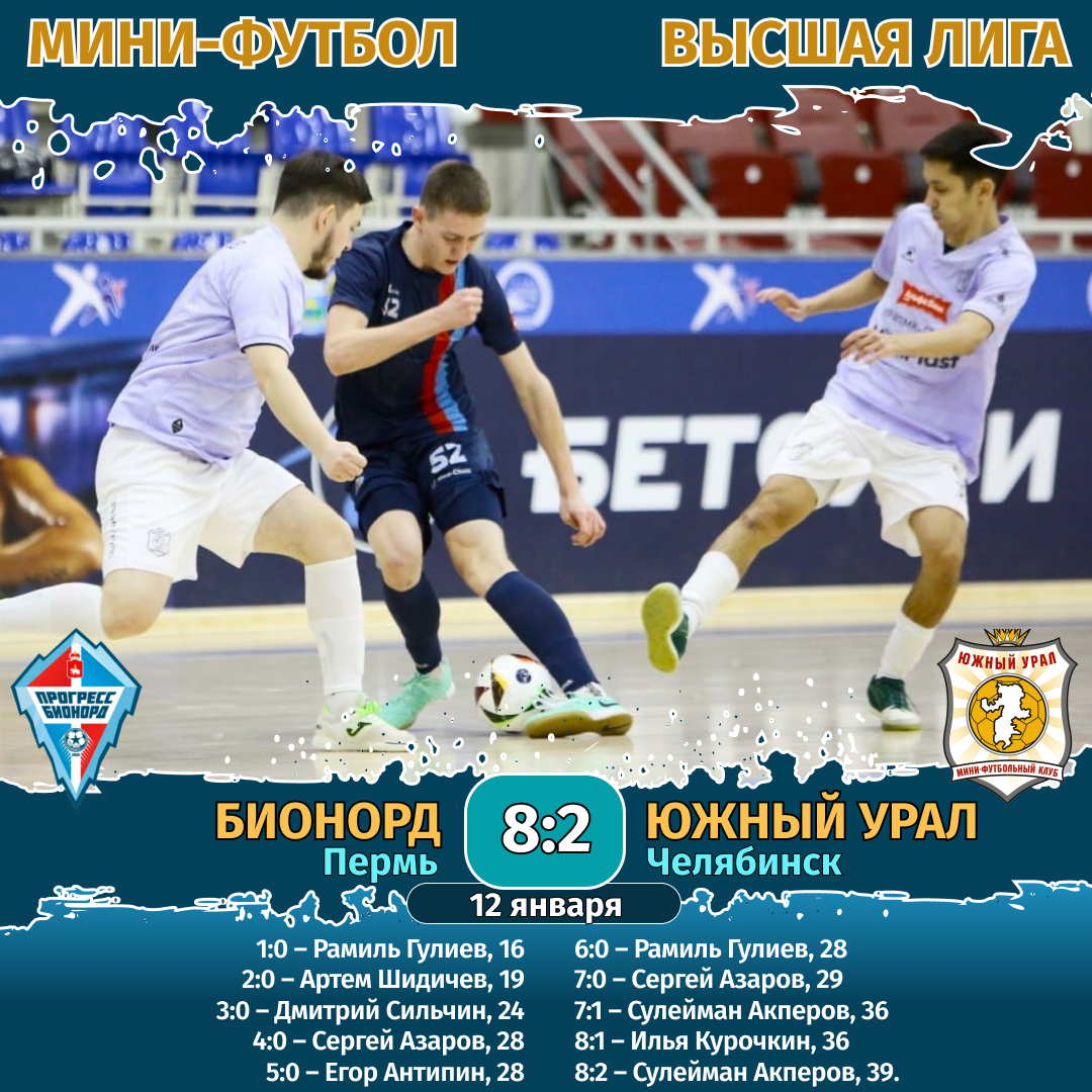 Мини-футбол. Чемпионат России. Высшая лига. Конференция «Восток». 12 января. «Прогресс-Бионорд» (Пермь) — «Южный Урал» (Челябинск) — 8:2.