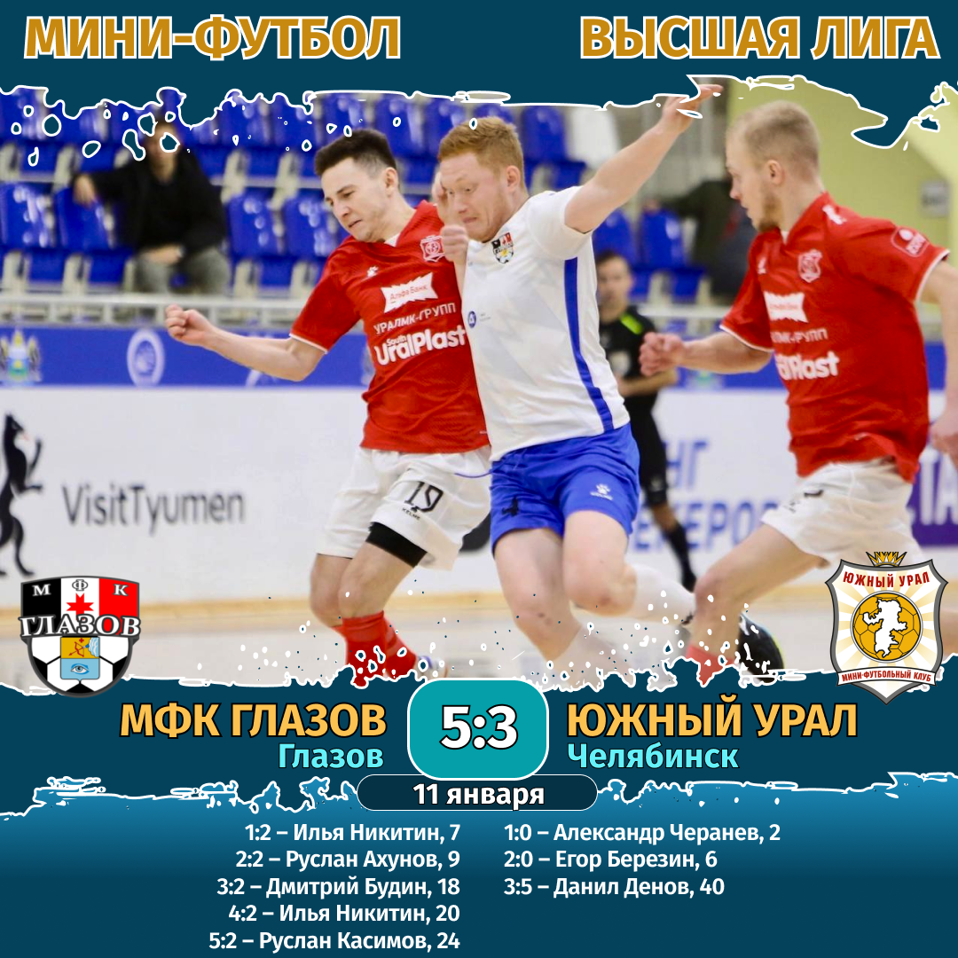 Мини-футбол. Чемпионат России. Высшая лига. Конференция «Восток». 11 января. МФК «Глазов» (Глазов) — «Южный Урал» (Челябинск) — 5:3.