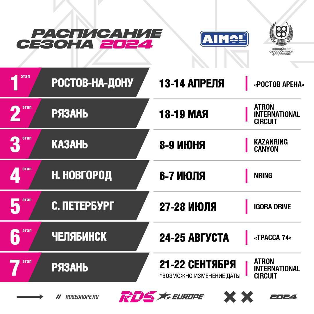 Сезон RDS Europe-2024 стартует 13—14 апреля на площадке «Ростов-Арена». Другие этапы примут Рязань, Казань, Нижний Новгород, Санкт-Петербург и Челябинск.