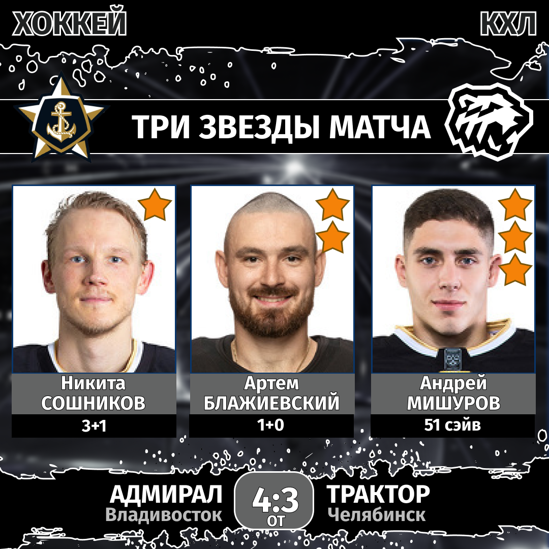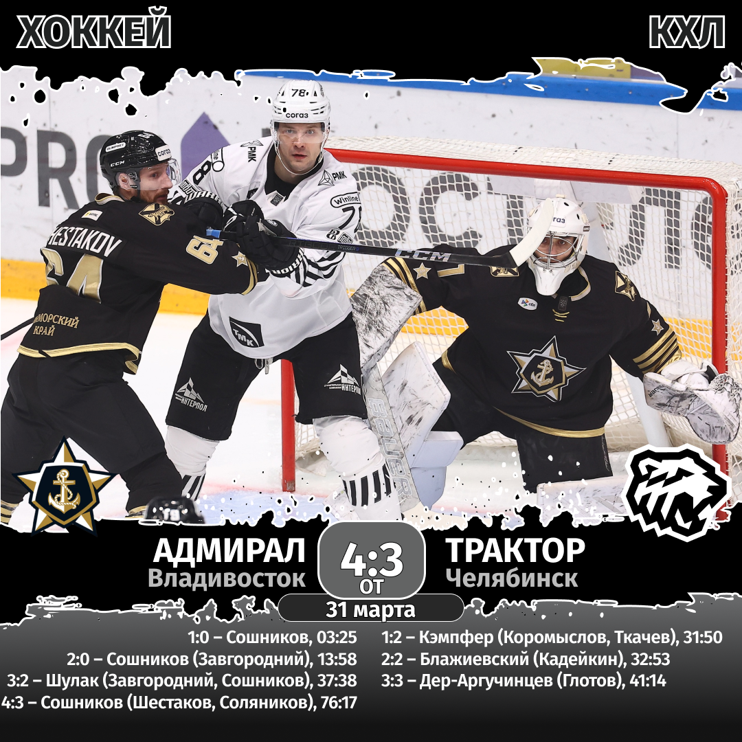 31 марта. «Адмирал» (Владивосток) — «Трактор» (Челябинск) — 4:3 от (2:0, 1:2, 0:1, 1:0).