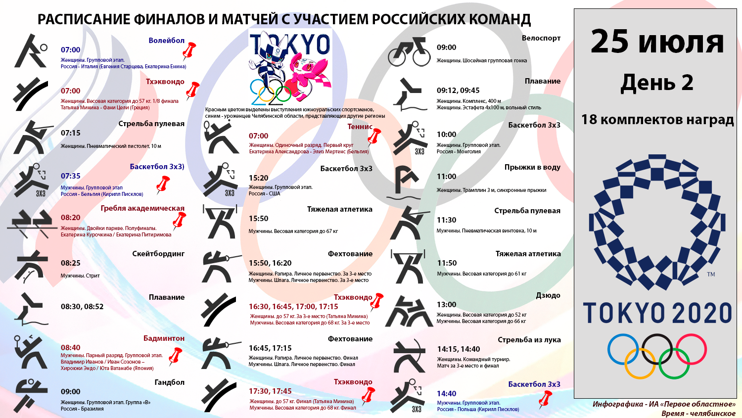 Сегодня, 25 июля, на Олимпийских играх в Токио стартует второй соревновательный день, в котором будут разыграны 18 комплектов наград. Наши главные надежды связаны с челябинской тхэквондисткой Татьяной Мининой. В весовой категории до 57 кг у нее есть шансы побороться за медали. Впервые выйдет на теннисный корт Екатерина Александрова, а вот для Владимира Иванова (бадминтон) и Екатерины Курочкиной (гребной спорт) Олимпиада может закончиться уже сегодня.