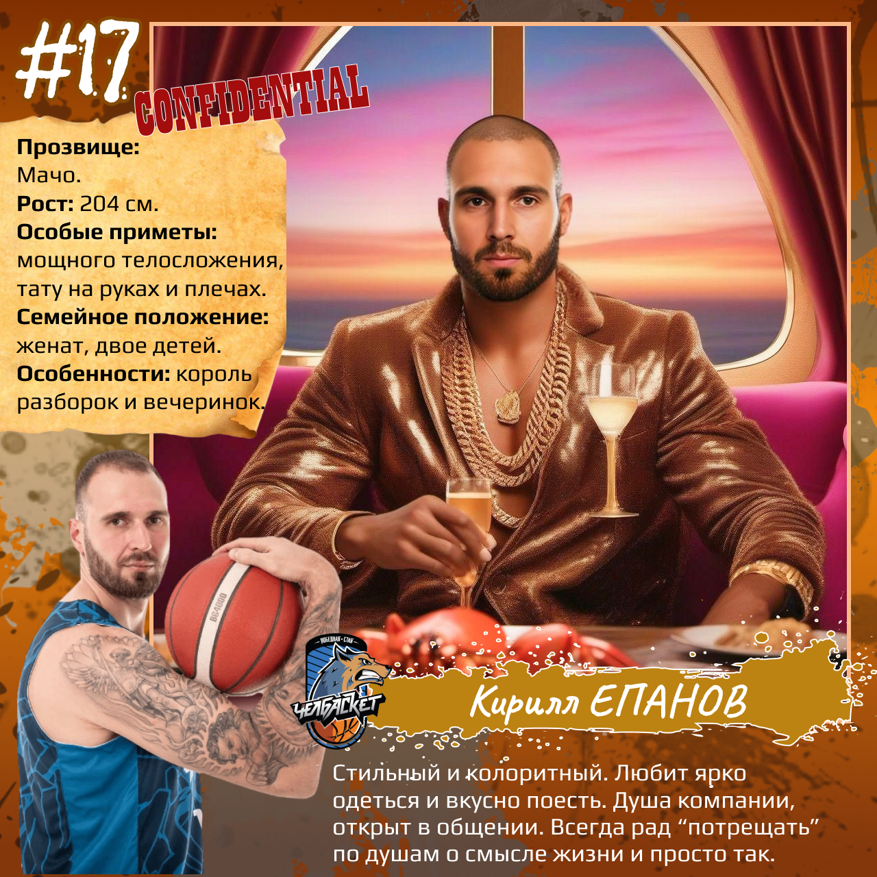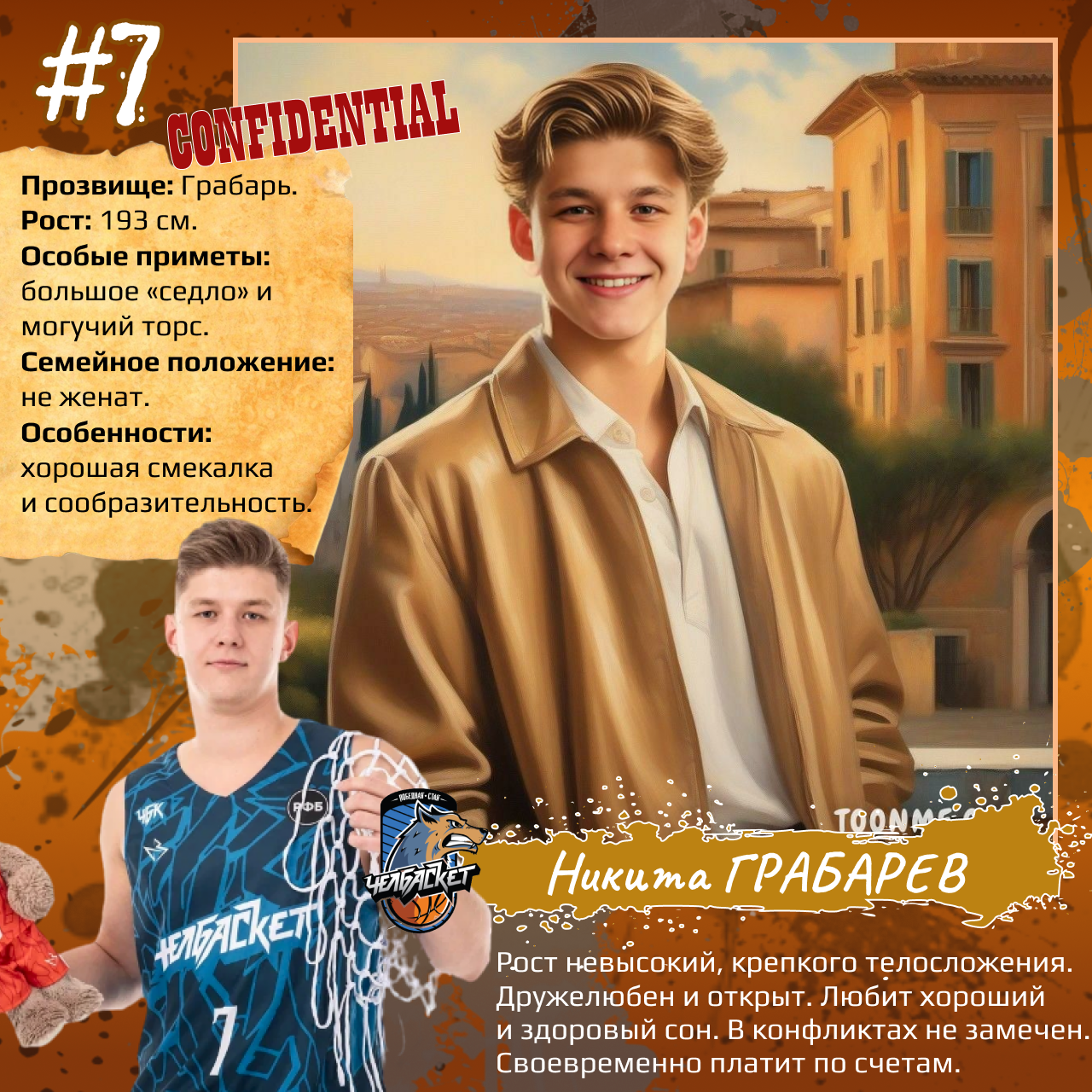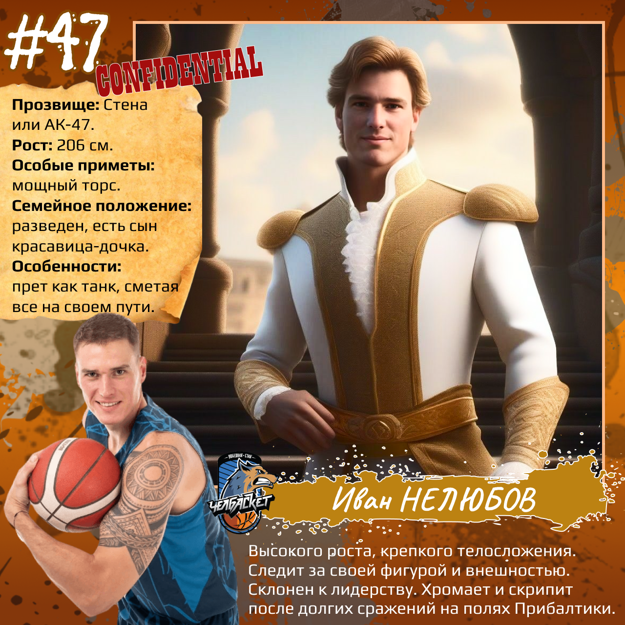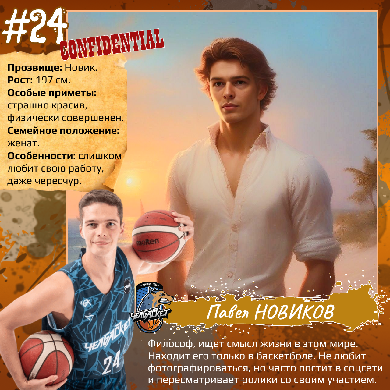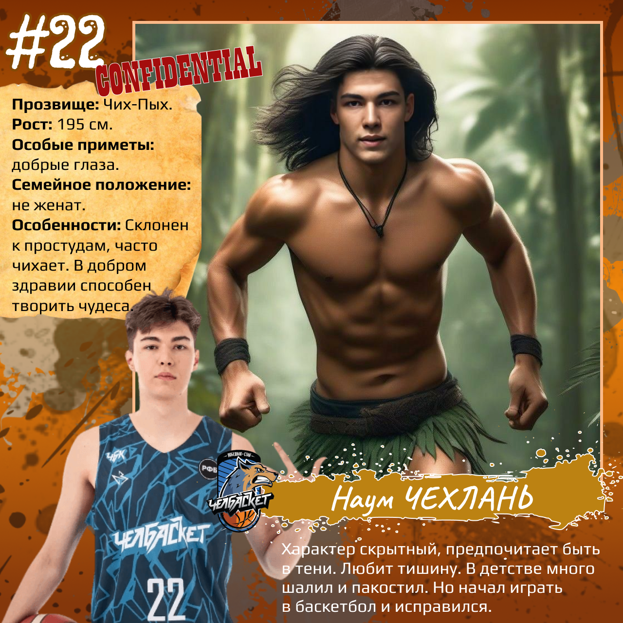 P. S. Карточки к игрокам мы сделали с помощью популярного приложения. Необычные образы дополнили описаниями в стиле старого советского мультфильма «Остров сокровищ». При этом пообщались с ребятами и попросили их рассказать о партнерах по команде. Получилось забавно, но в некоторых случаях на грани фола. Далеко не факт, что наше представление об игроках «Челбаскета» близко к реальности. Но, как говорится, любые случайности — совпадение, а в каждой шутке есть доля правды. Уверены, что сами ребята на нас не в обиде.