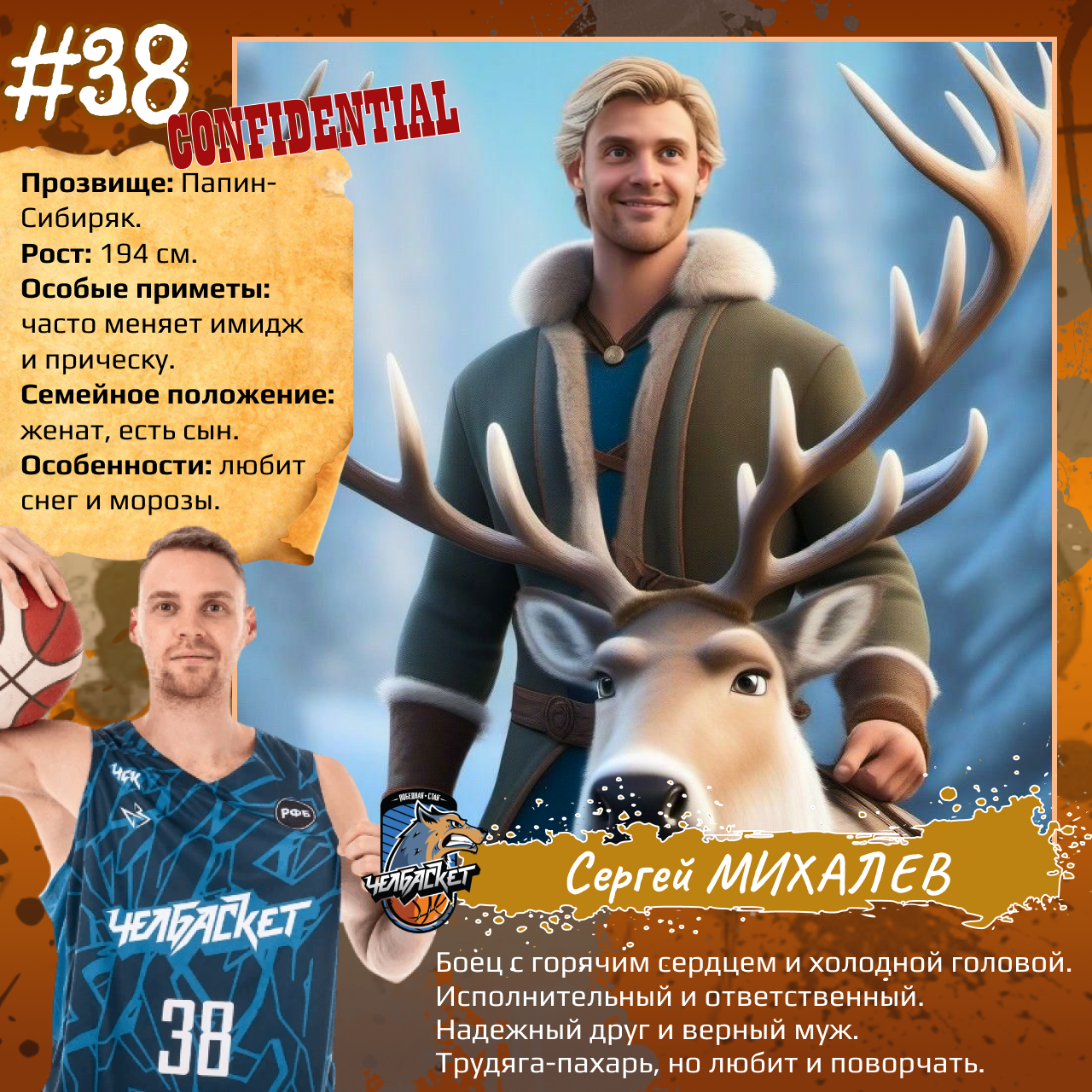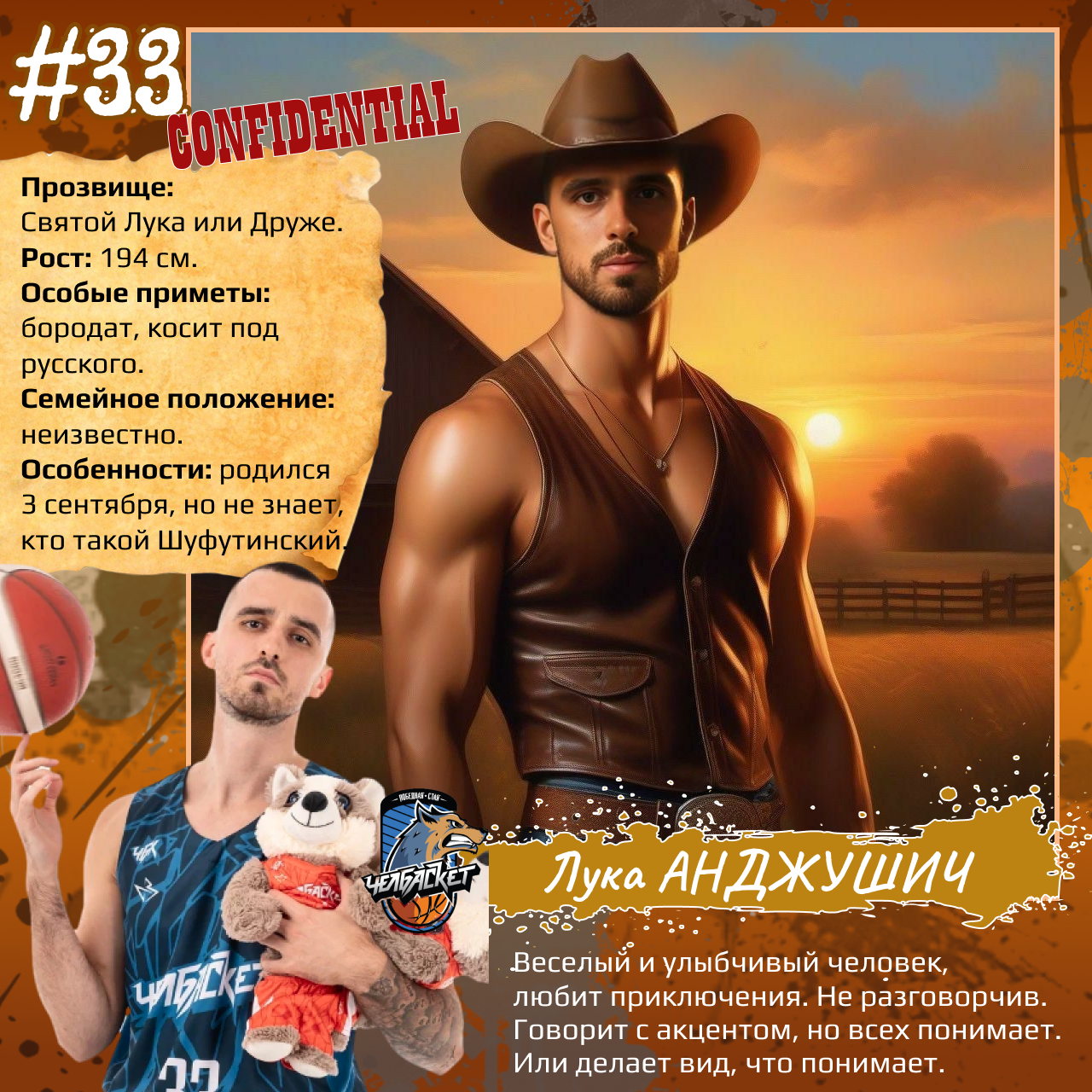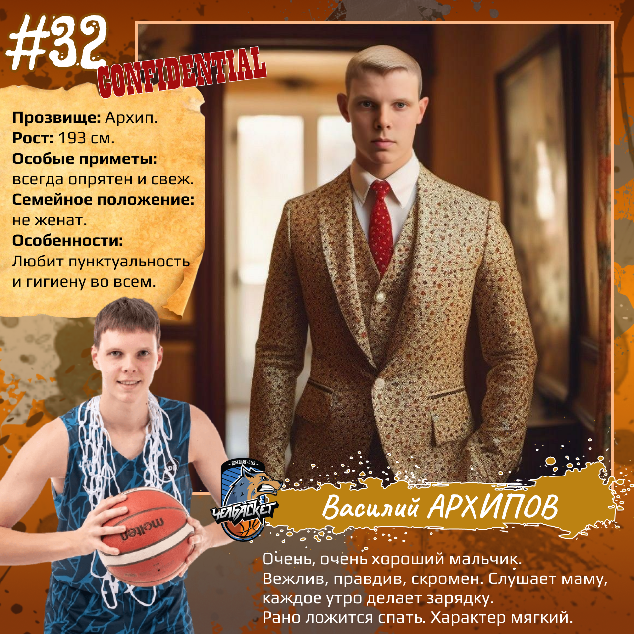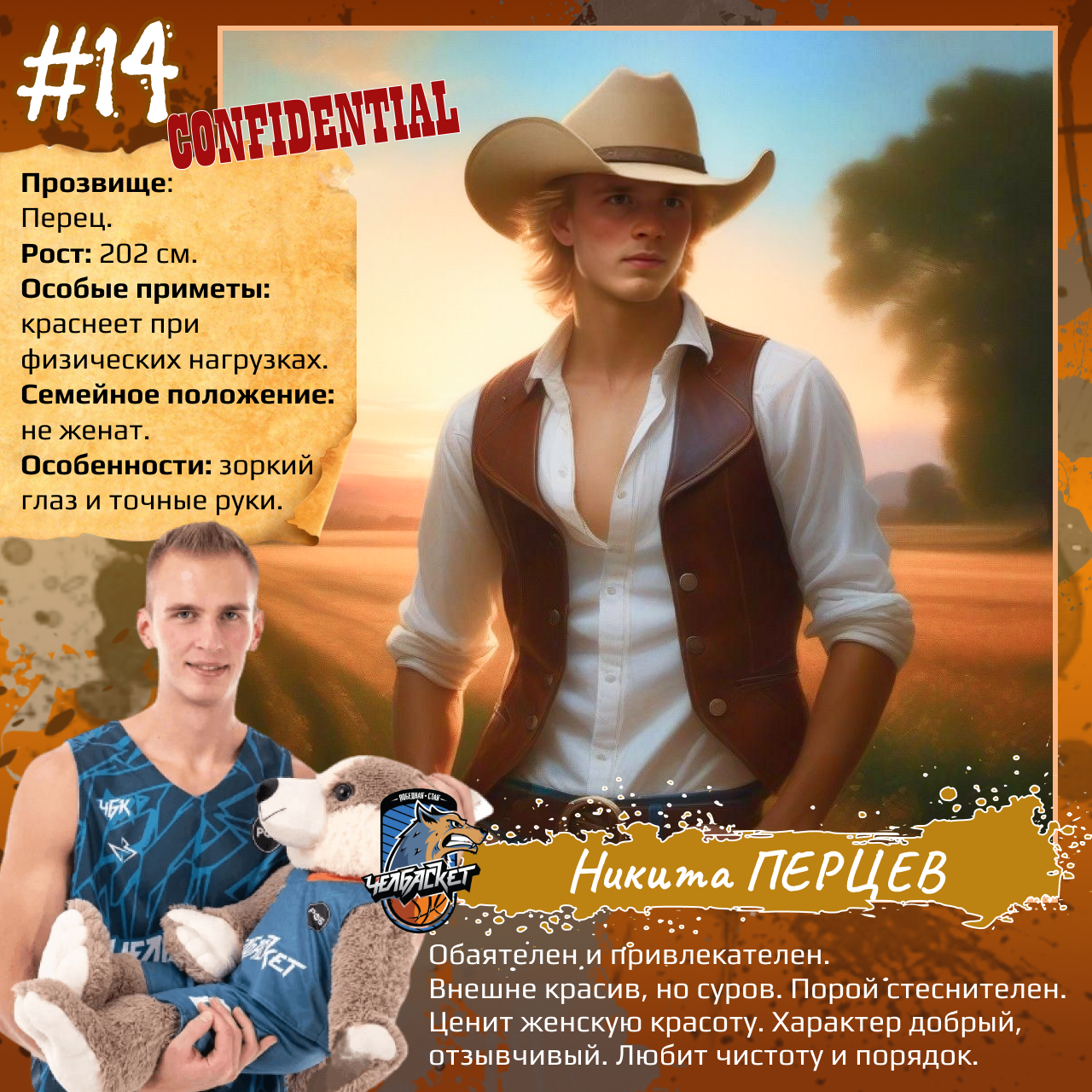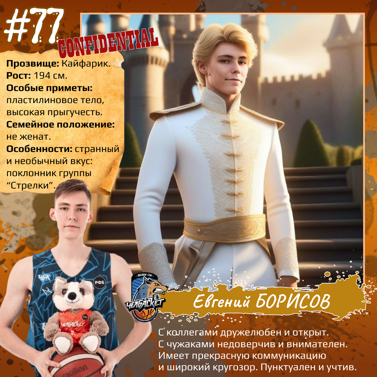 P. S. Карточки к игрокам мы сделали с помощью популярного приложения. Необычные образы дополнили описаниями в стиле старого советского мультфильма «Остров сокровищ». При этом пообщались с ребятами и попросили их рассказать о партнерах по команде. Получилось забавно, но в некоторых случаях на грани фола. Далеко не факт, что наше представление об игроках «Челбаскета» близко к реальности. Но, как говорится, любые случайности — совпадение, а в каждой шутке есть доля правды. Уверены, что сами ребята на нас не в обиде.