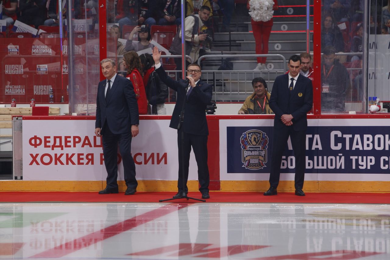 «Я рад приветствовать у нас на Южном Урале сборные России и Белоруссии. Сегодня будет яркая, интересная игра. Кто бы ни старался вычеркнуть наши сборные из мирового хоккея, у них это не получится. Я уверен, мы вернемся и победим!» — выступил с приветственным словом к участникам матча и зрителям Алексей Текслер.