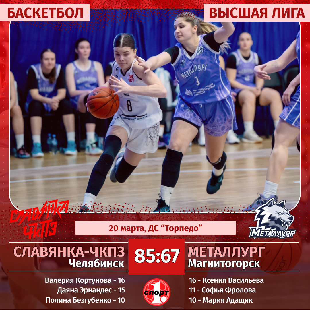 Женская баскетбольная команда «Славянка-ЧКПЗ» завершила регулярный чемпионат в Высшей лиге двумя победами над лидером турнира — магнитогорским «Металлургом» — 66:61 и 85:67. Главной героиней встреч стала Даяна Эрнандес, показавшая фантастическую игру. Результаты матчей не изменили расстановку сил в таблице: магнитогорский клуб занял первое место, челябинская команда финишировала второй, сообщает корреспондент ИА «Первое областное».