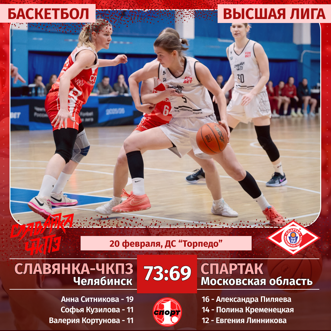 Баскетбол. Сезон-2025/2026. Высшая лига. Женщины. 20 февраля. «Славянка-ЧКПЗ» — «Спартак» (Московская область) — 73:69 (22:25, 20:13, 9:14, 22:17).