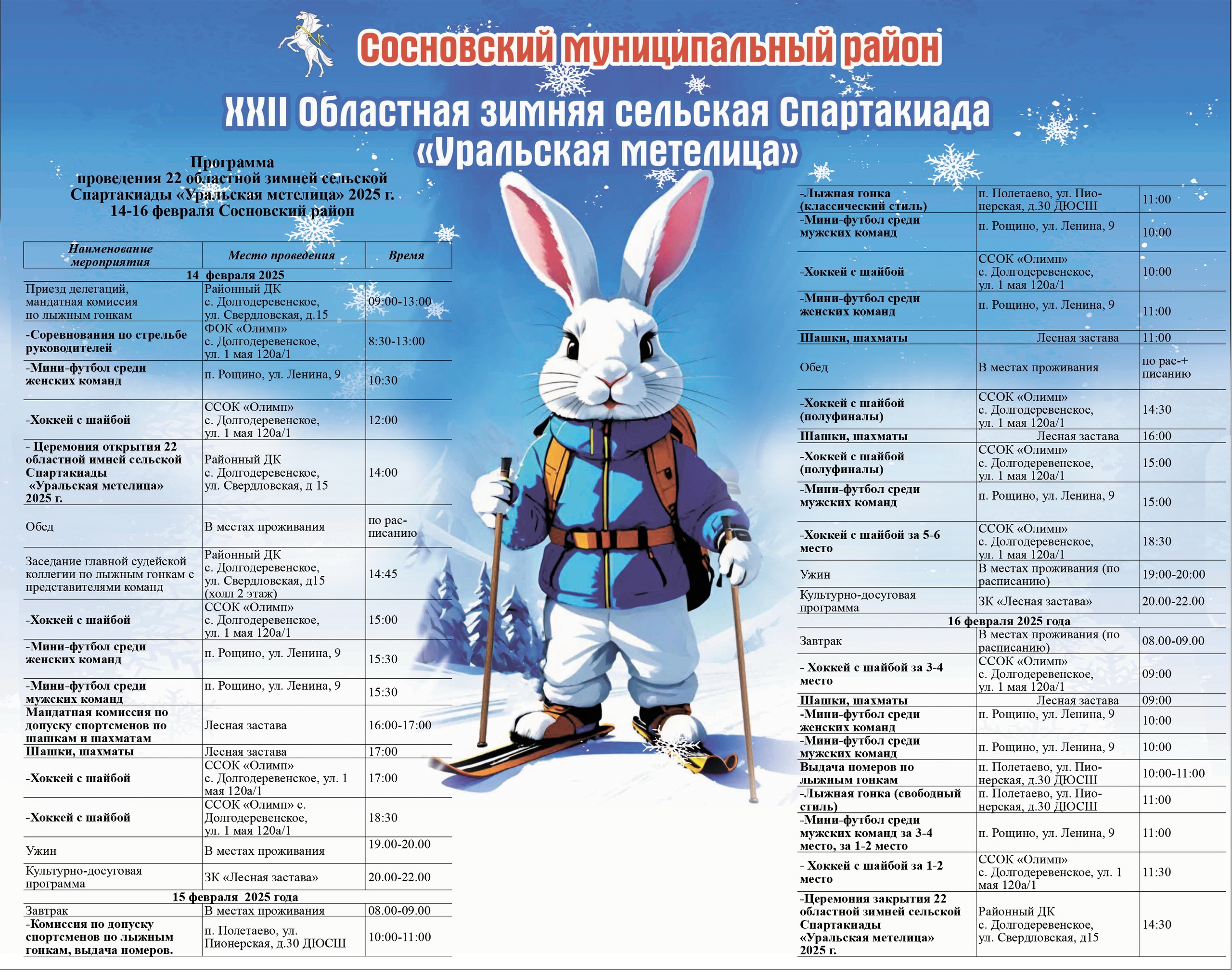 Завтра, 14 февраля, в Сосновском районе пройдут финальные старты XII Областной зимней сельской спартакиады «Уральская метелица». Турниры по семи видам спорта состоятся в поселках Долгодеревенское, Рощино и Полетаево. Главы районов Челябинской области и их замы будут состязаться в стрельбе из пневматической винтовки. Публикуем подробную программу соревнований и рассказываем, почему «Уральская метелица» — это маленькая сельская Олимпиада.