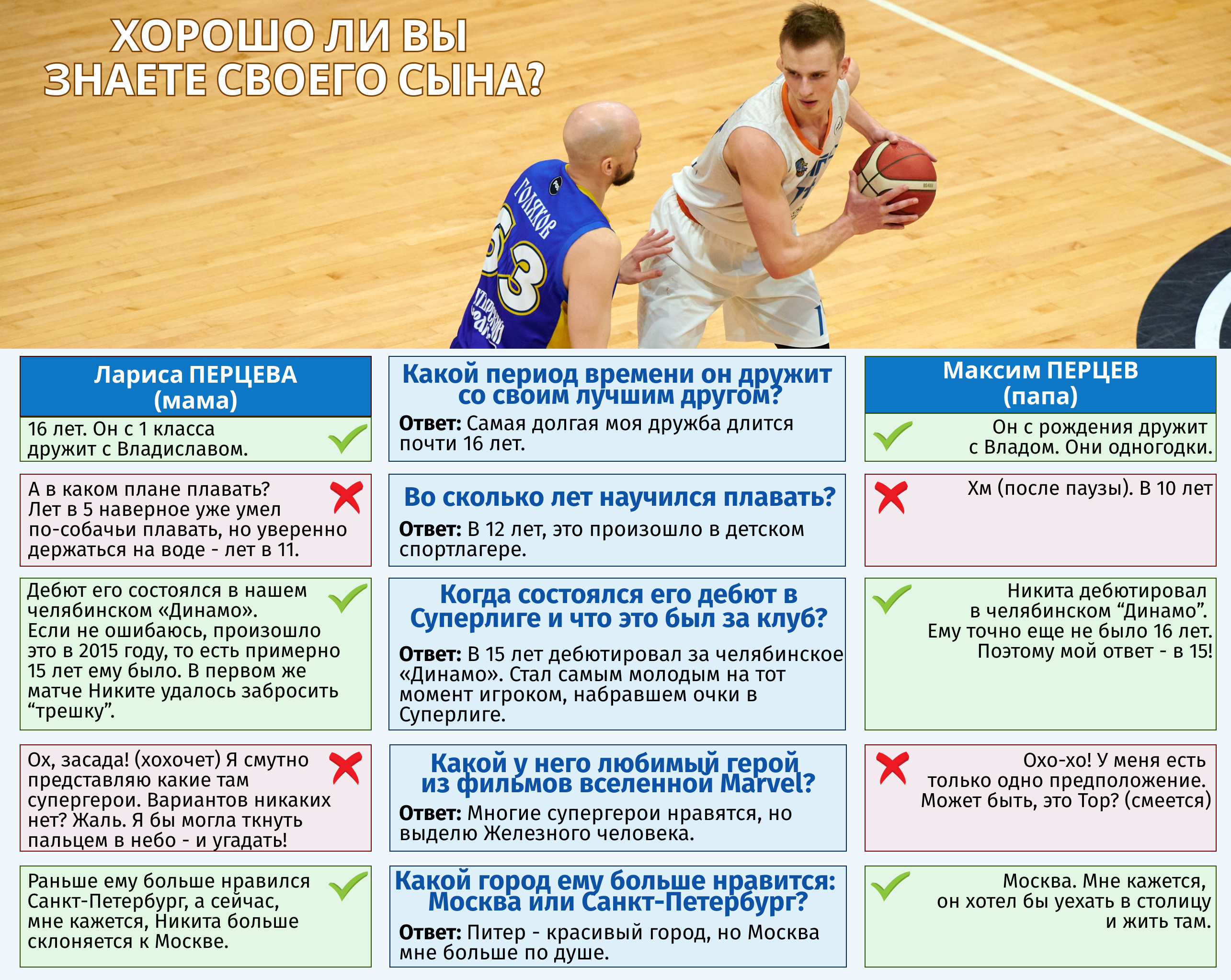 Итоги: Думаю, вы согласитесь, что здесь боевая ничья. Как и следовало ожидать, папа Никиты досконально знает все основные этапы карьеры сына как баскетболиста, а мама — лучше осведомлена о его успеваемости и учебе в школе. И все-таки немного странно, что оба родителя не помнят, что Никита в школе ломал руку. Ее разве не гипсовали?