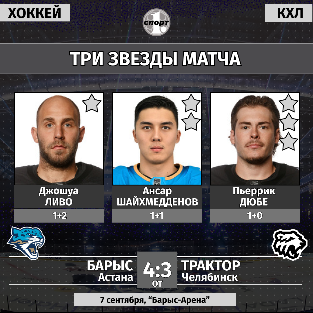 Хоккей. Сезон-2025/2026. Чемпионат КХЛ. 7 сентября. «Барыс» (Астана) — «Трактор» (Челябинск) — 4:3 от (1:1, 1:1, 1:1, 1:0).