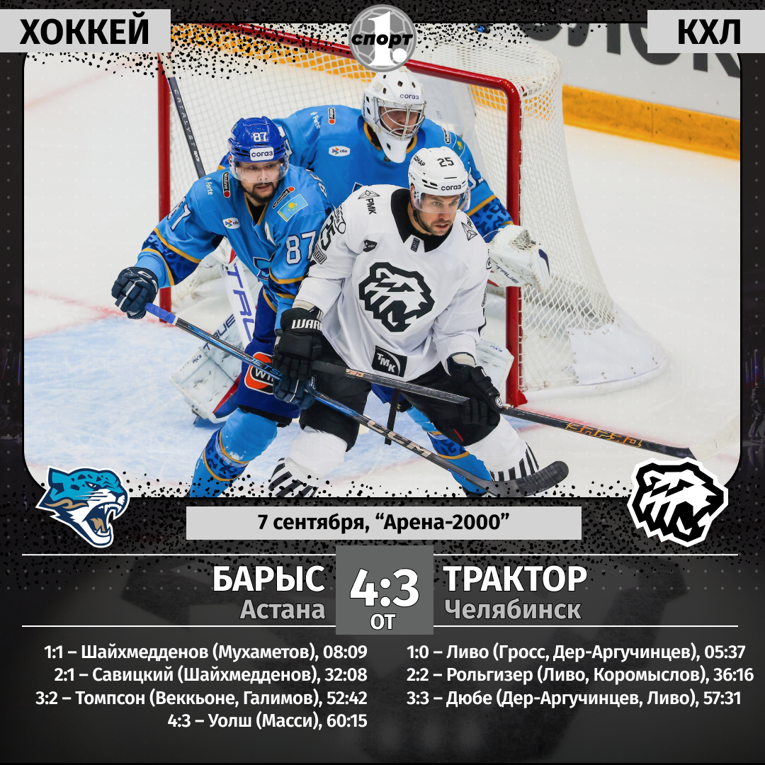Хоккей. Сезон-2025/2026. Чемпионат КХЛ. 7 сентября. «Барыс» (Астана) — «Трактор» (Челябинск) — 4:3 от (1:1, 1:1, 1:1, 1:0).