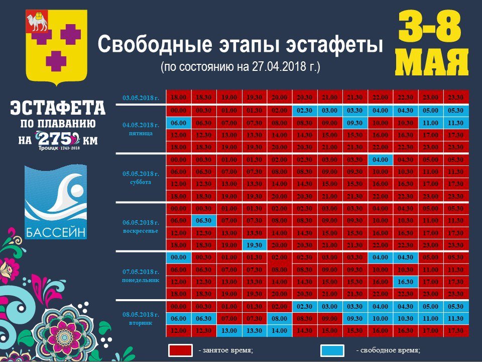 Уже подана заявка на включение данного проекта в книгу рекордов Гиннесса. Предыдущий зафиксированный рекорд — 176 километров. Откроет эстафету глава города Александр Виноградов. Уже заняты практически все этапы, осталось немного свободного времени. Бассейн приглашает всех желающих принять участие в эстафете на 275 километров и войти в историю нашего города. — говорится на сайте Троицкого городского округа.