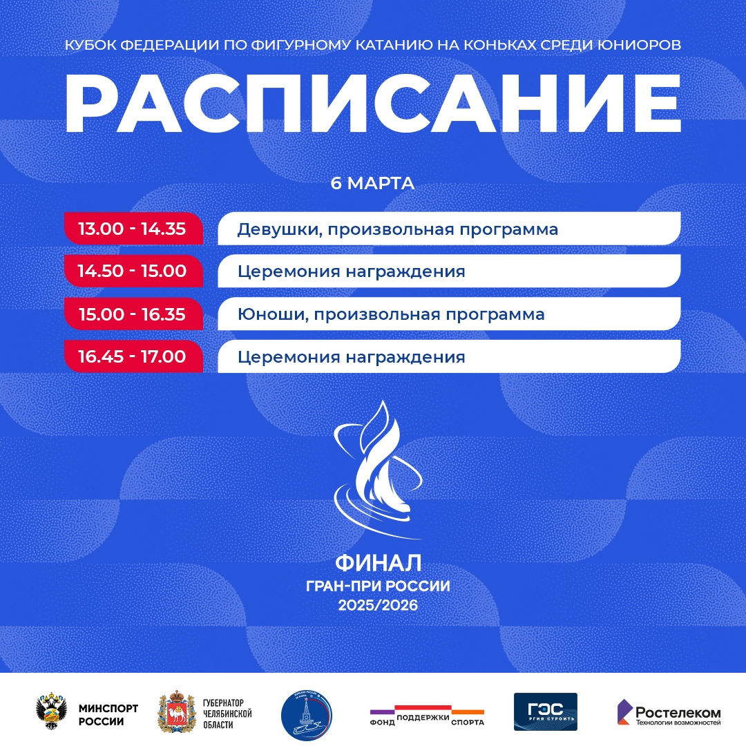 Напомним, что по окончании юниорских соревнований здесь же, в арене «Трактор», состоится финал Гран-при России по фигурному катанию с участием взрослых спортсменов — лидеров национальной команды. Этот турнир пройдет с 6 по 9 марта.