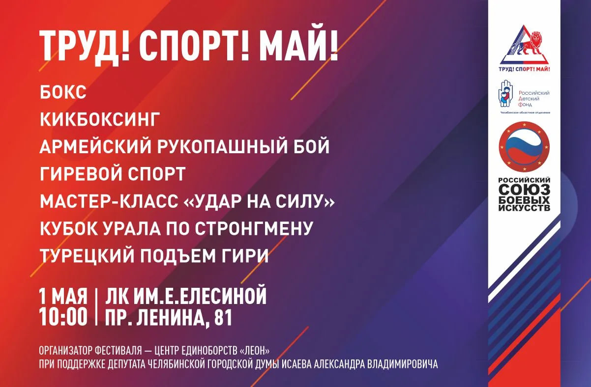 Организаторы приготовили для горожан семь зрелищных дисциплин. Так, пройдут состязания по боксу, кикбоксингу, армейскому рукопашному бою, гиревому спорту, а также Кубок Урала по силовому экстриму, мастер-класс на силу удара и турецкий подъем гири. Все это состоится в рамках фестиваля «Труд, спорт, май».