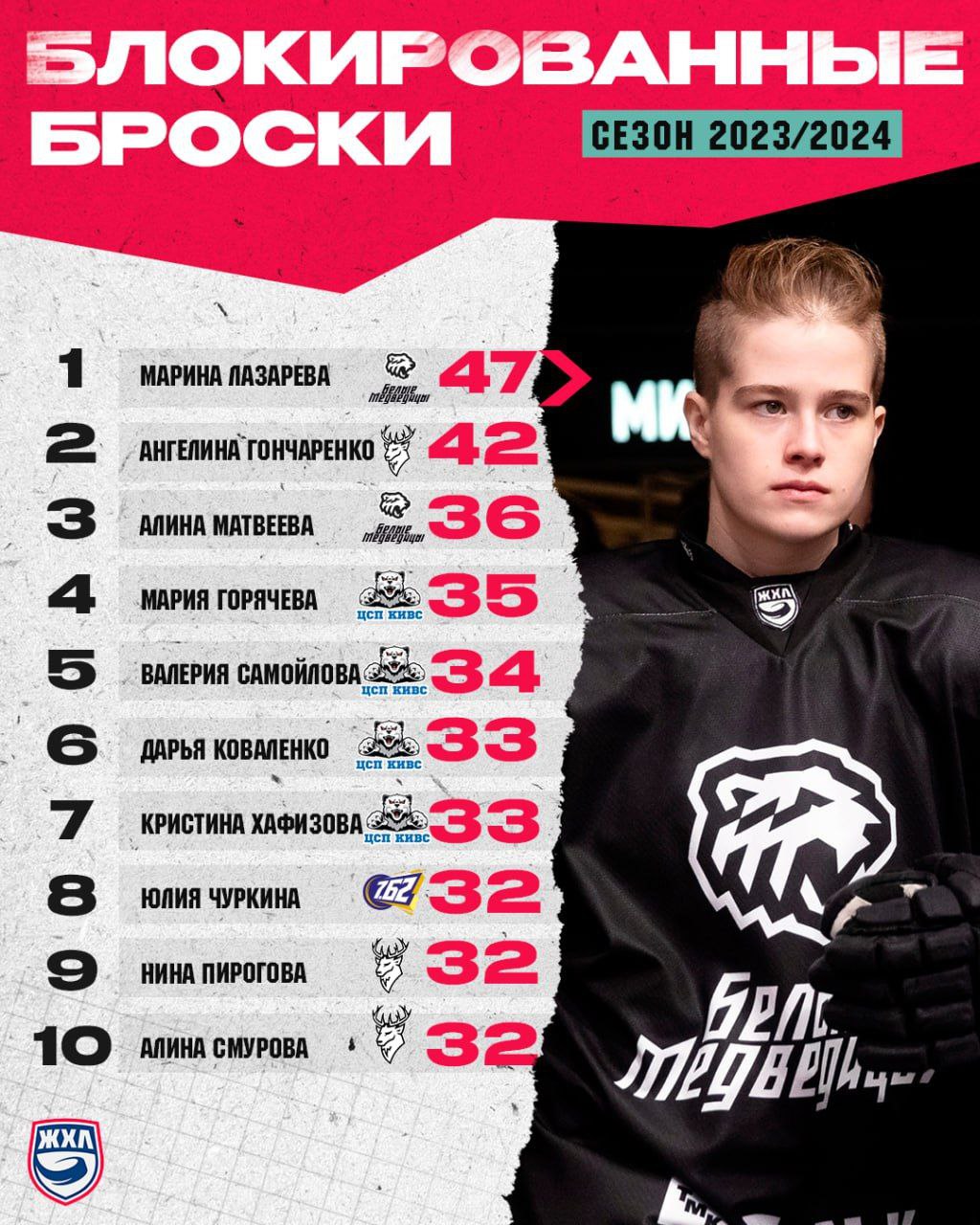 Статистические данные по итогам текущего чемпионата ЖХЛ были опубликованы на сайте лиги. С сезона-2023/2024 здесь стали подсчитывать и количество заблокированных бросков. По этому показателю защитник челябинского клуба Марина Лазарева вне конкуренции. В 18 матчах она блокировала 47 бросков соперниц. Занимающие вторую и третью строчку в списке Ангелина Гончаренко («Торпедо») и Алина Матвеева («Белые медведицы») сделали 42 и 36 блок-аутов соответственно.