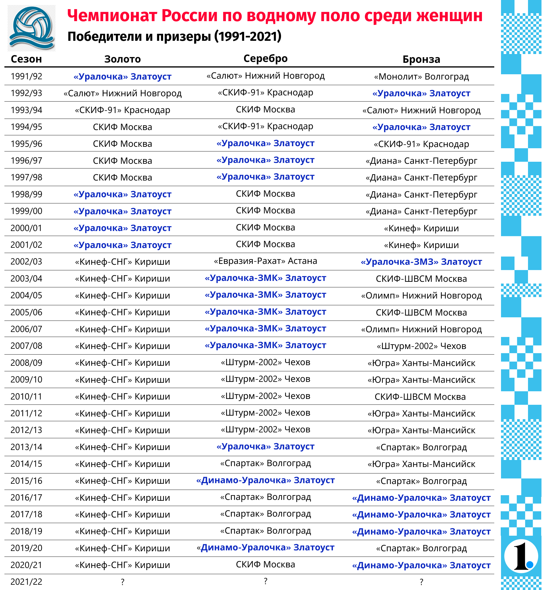 Женская ватерпольная команда «Уралочка» на сегодня является самым титулованным и стабильным клубом страны. В истории проведения чемпионатов России южноуральский клуб чаще других финишировал в тройке призеров. По этому показателю стоит рядом с нашей командой разве что 19-кратный чемпион страны «Кинеф» из Киришей. Для сравнения: «Уралочка» становилась призером 23 раза, команда из Ленинградской области — 21.