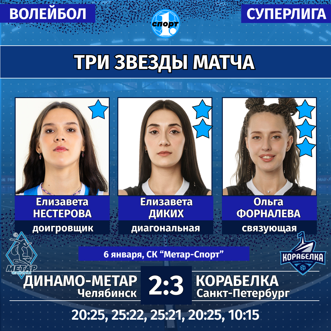 6 января. «Динамо-Метар» (Челябинск) — «Корабелка» (Санкт-Петербург) — 2:3 (20:25, 25:22, 25:21, 20:25, 10:15).