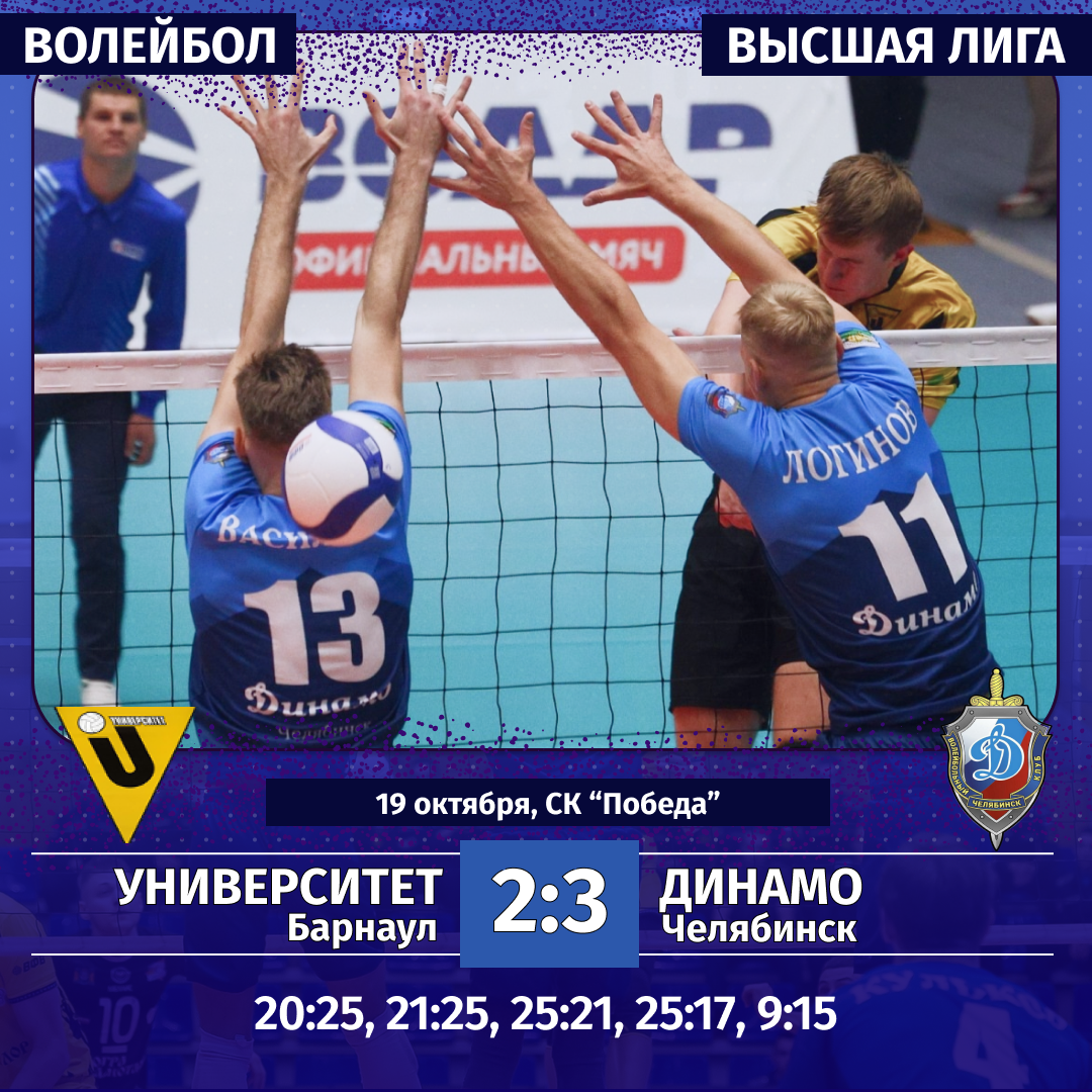 19 октября. «Университет» (Барнаул) — «Динамо» (Челябинск) — 2:3 (20:25, 21:25, 25:21, 25:17, 9:15).