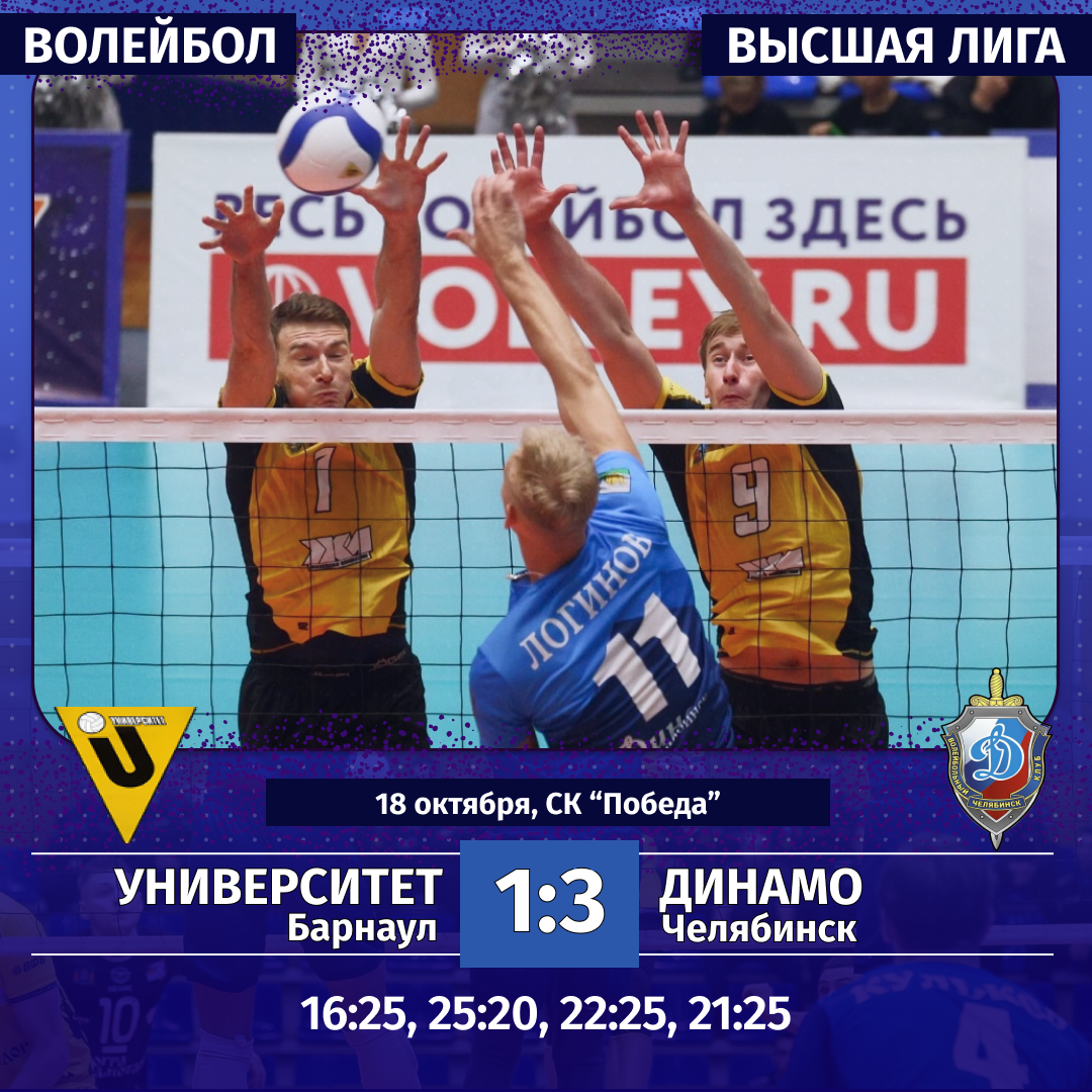 18 октября. «Университет» (Барнаул) — «Динамо» (Челябинск) — 1:3 (16:25, 25:20, 22:25, 21:25).