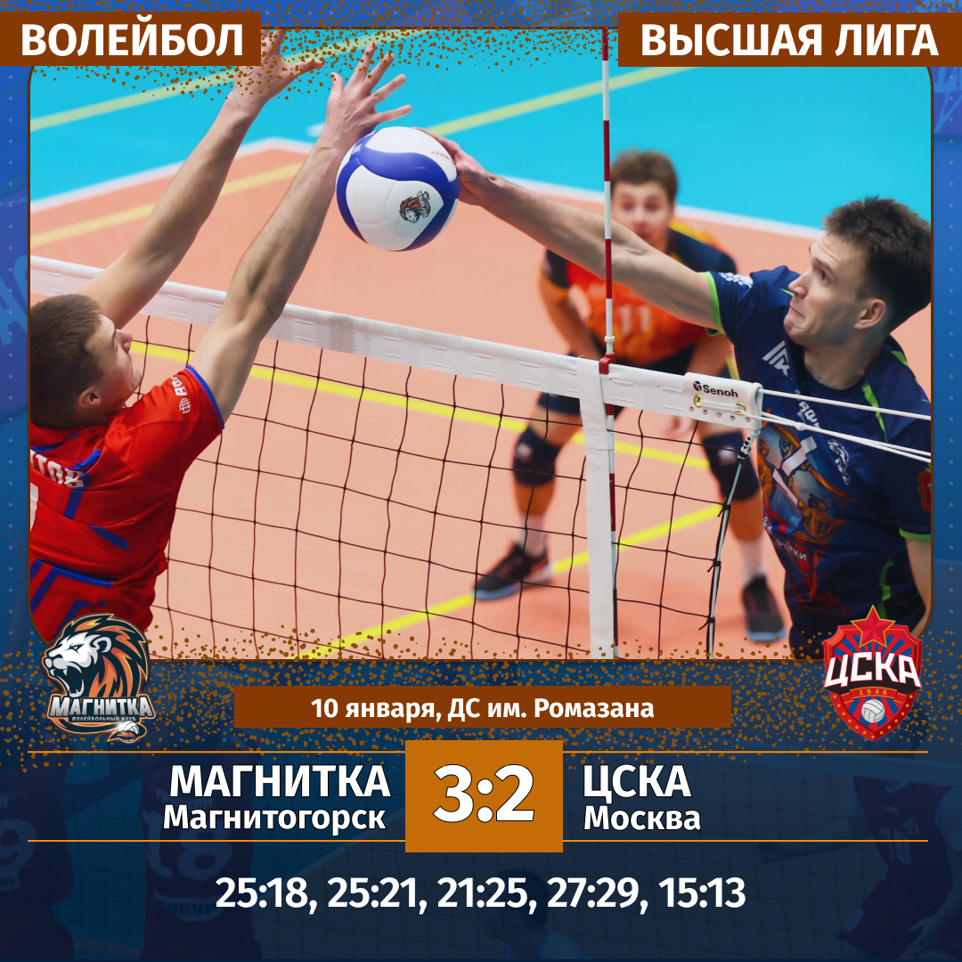 10—11 января. «Магнитка» (Магнитогорск) — ЦСКА (Москва) — 3:2 (25:18, 25:21, 21:25, 27:29, 15:13) и 3:1 (30:28, 16:25, 25:23, 25:23).