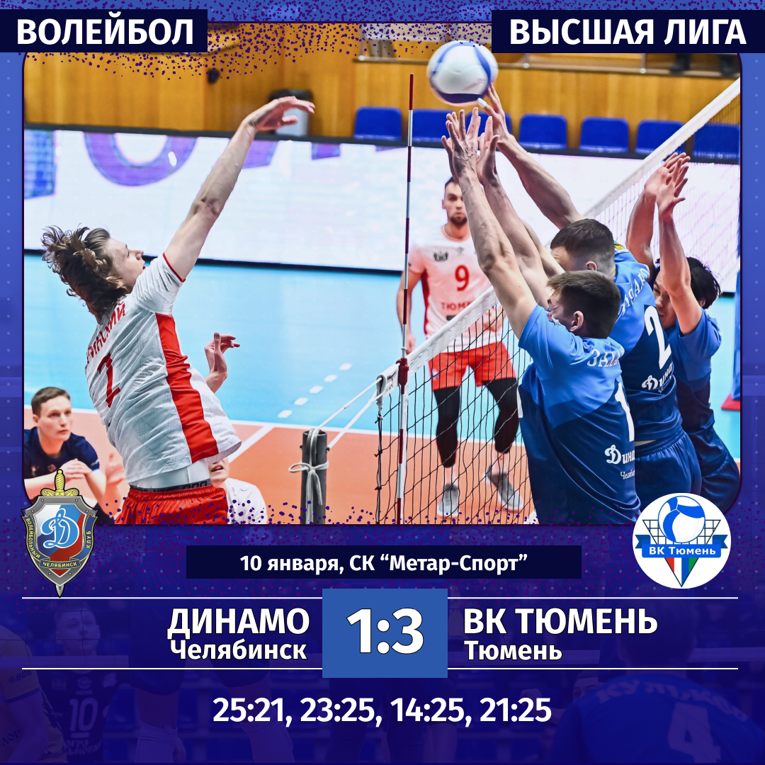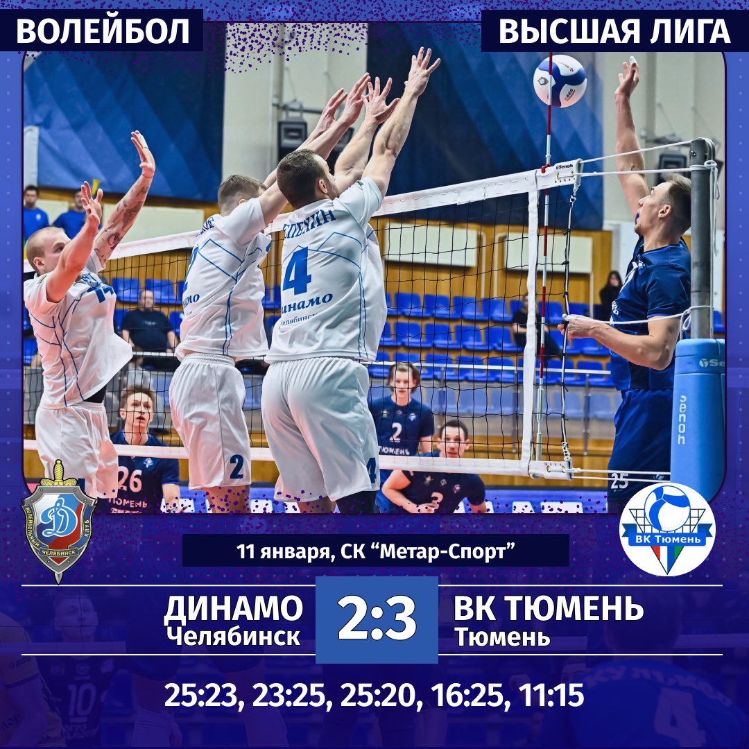 10—11 января. «Динамо» (Челябинск) — ВК «Тюмень» — 1:3 (25:21, 23:25, 14:25, 21:25) и 2:3 (25:23, 23:25, 25:20, 16:25, 11:15).