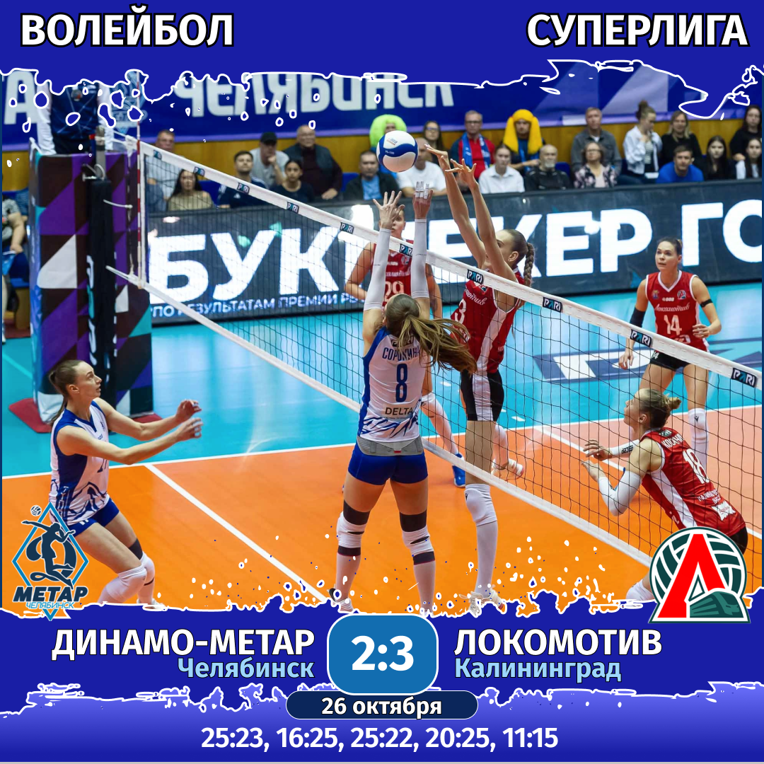 26 октября. «Динамо-Метар» (Челябинск) — «Локомотив» (Калининград) — 2:3 (25:23, 16:25, 25:22, 20:25, 11:15).