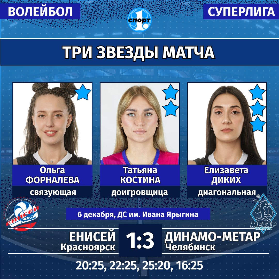 6 декабря. «Енисей» (Красноярск) — «Динамо-Метар» (Челябинск) — 1:3 (20:25, 22:25, 25:20, 16:25).