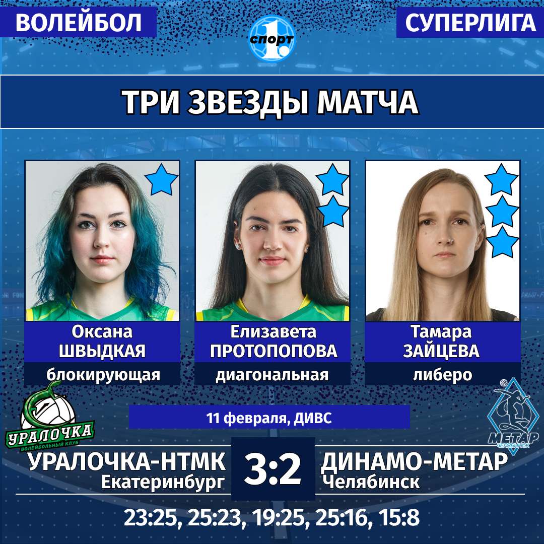 11 февраля. «Уралочка-НТМК» (Екатеринбург) — «Динамо-Метар» (Челябинск) — 3:2 (23:25, 25:23, 19:25, 25:16, 15:8).